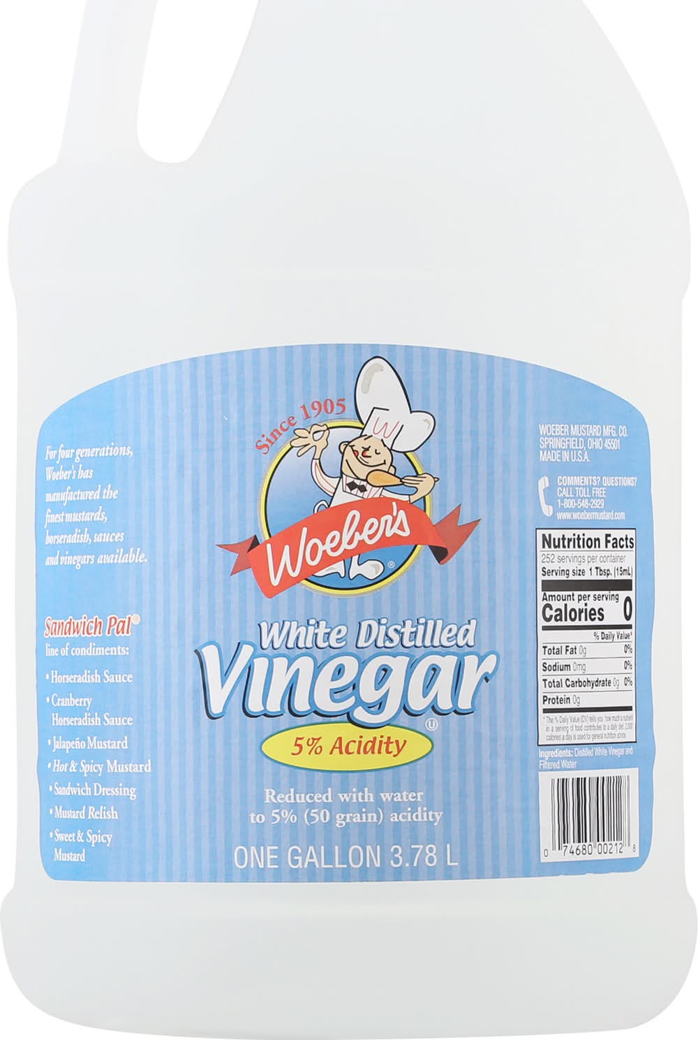 It is a versatile culinary product that has been crafted with care since 1905. It features a consistent 5% acidity level, which is ideal for a variety of cooking, cleaning, and health purposes. As a testament to its quality and tradition, it represents the legacy of four generations in manufacturing condiments. This product is made in the USA and offering ample quantity for multiple uses. • Size: 4 • Number of servings: 252 • Woeber Mustard Mfg. Co., Springfield, OH, 45501, Ph: 800-548-2929 • Packaging: Reusable