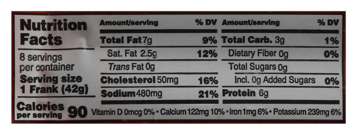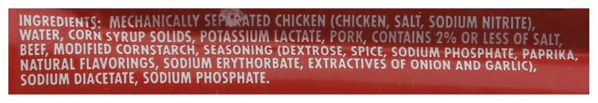 Ingredients: Mechanically Separated Chicken (Chicken, Salt, Sodium Nitrite), Water, Corn Syrup Solids, Potassium Lactate, Pork, Contains 2% or Less of Salt, Beef, Modified Cornstarch, Seasoning (Dextrose, Spice, Sodium Phosphate, Paprika, Natural Flavorings, Sodium Erythorbate, Extractives of Onion and Garlic), Sodium Diacetate, Sodium Phosphate