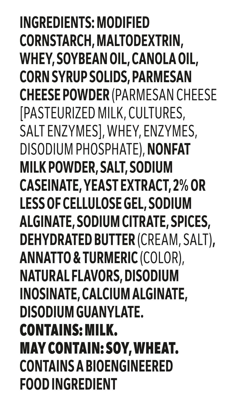 Ingredients: MODIFIED CORNSTARCH, MALTODEXTRIN, WHEY, SOYBEAN OIL, CANOLA OIL, CORN SYRUP SOLIDS, PARMESAN CHEESE POWDER (PARMESAN CHEESE [PASTEURIZED MILK, CULTURES, SALT ENZYMES], WHEY, ENZYMES, DISODIUM PHOSPHATE), NONFAT MILK POWDER, SALT, SODIUM CASEINATE, YEAST EXTRACT, 2% OR LESS OF CELLULOSE GEL, SODIUM ALGINATE, SODIUM CITRATE, SPICES, DEHYDRATED BUTTER (CREAM, SALT), ANNATTO TURMERIC (COLOR), NATURAL FLAVORS, DISODIUM INOSINATE, CALCIUM ALGINATE, DISODIUM GUANYLATE. Contains: CONTAINS: MILK. MAY CONTAIN: SOY, WHEAT.