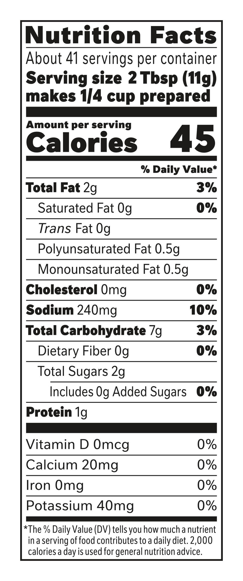 Trio Alfredo Sauce Mix offers a rich and authentic flavor, suitable for creating a variety of pasta dishes. Each serving contains low saturated fat, 0 grams of trans fat, and no cholesterol. While it does not have added MSG, it contains free glutamate from natural ingredients such as cheese and yeast extract. The mix is designed for quick preparation, requiring only one minute to mix, and it also includes bioengineered food ingredients. It is produced in Canada. • Flavor: Alfredo • Size: 8