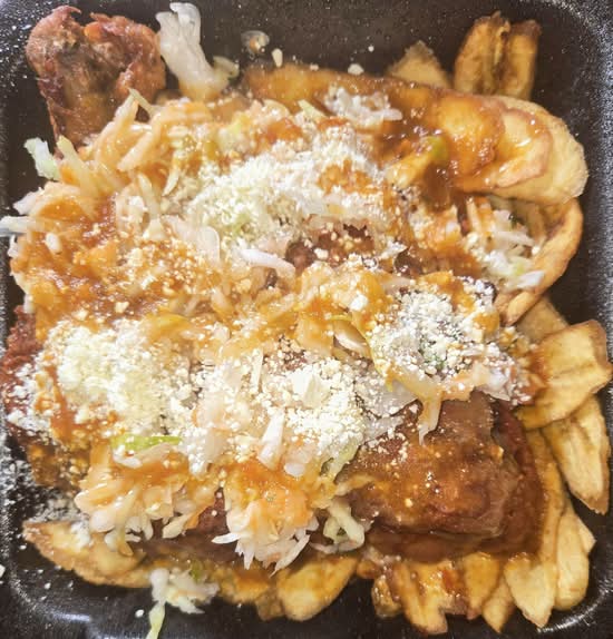 Ensalada, tajadas de banano fritas. / Salad, fried banana slices.
