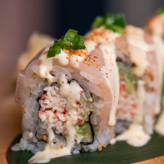 This delicious roll is made with fresh Hamachi, creamy hass avocado, cool cucumber, and krab salad, all wrapped in delicate seaweed and perfectly cooked rice. We sprinkle toasted sesame seeds for a crunchy texture and add a touch of spice with sliced jalapeños, finished with a yuzu aioli.