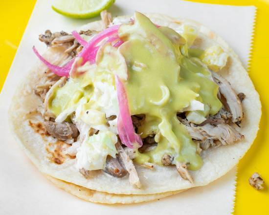 a l’orange PREMIUM CHICKEN carnitas, pineapple cream slaw, pickled red onion, cilantro, salsa verde, on double tortilla Made with soft handmade corn tortilla by our master tortilleras. Price is per taco