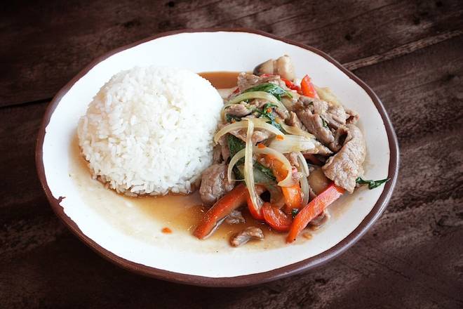 Choice of (chicken, beef, shrimp, tofu) with onion, pepper, spicy basil sauce served with jasmine rice