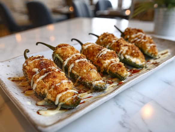 Jalapeño deep fried, Vegan cream cheese and unagi sauce on top.