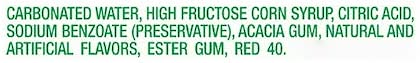 Ingredients: Carbonated Water, High Fructose Corn Syrup, Citric Acid, Sodium Benzoate Preservative, Acacia Gum, Natural and Artificial Flavors, Ester Gum, Red 40.