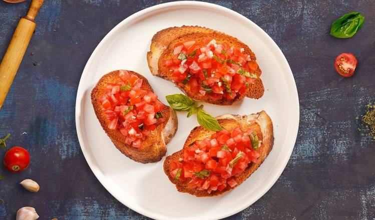 House baked bread topped with fresh diced tomatoes, garlic, olive oil, sea salt, and parsley.