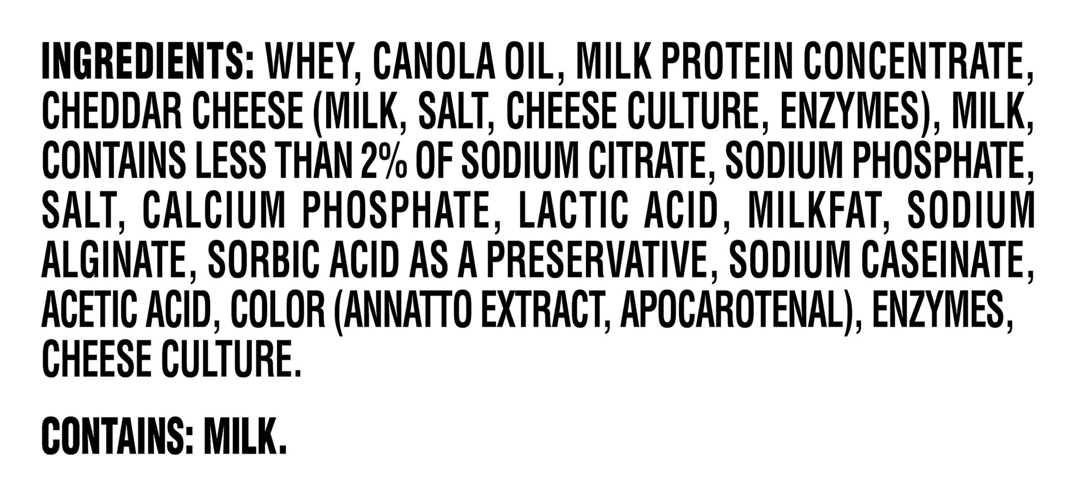 Ingredients: Whey, Canola Oil, Milk Protein Concentrate, Cheddar Cheese (Milk, Salt, Cheese Culture, Enzymes), Milk, Contains Less than 2% of Sodium Citrate, Sodium Phosphate, Salt, Calcium Phosphate, Lactic Acid, Milkfat, Sodium Alginate, Sorbic Acid as a Preservative, Sodium Caseinate, Acetic Acid, Color (Annatto Extract, Apocarotenal), Enzymes, Cheese Culture Contains: Milk