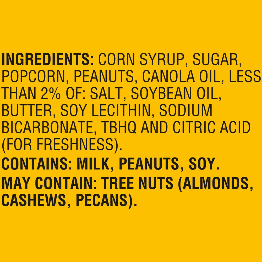 Ingredients: Corn Syrup, Sugar, Popcorn, Peanuts, Canola Oil, Less than 2% of: Soybean Oil, Butter, Soy Lecithin, Salt, Sodium Bicarbonate, Citric Acid and TBHQ (for freshness), . CONTAINS: MILK, PEANUTS, SOY. MAY CONTAIN: TREE NUTS (ALMONDS, CASHEWS, PECANS), . Contains: milk, Peanuts, Soybeans, Corn