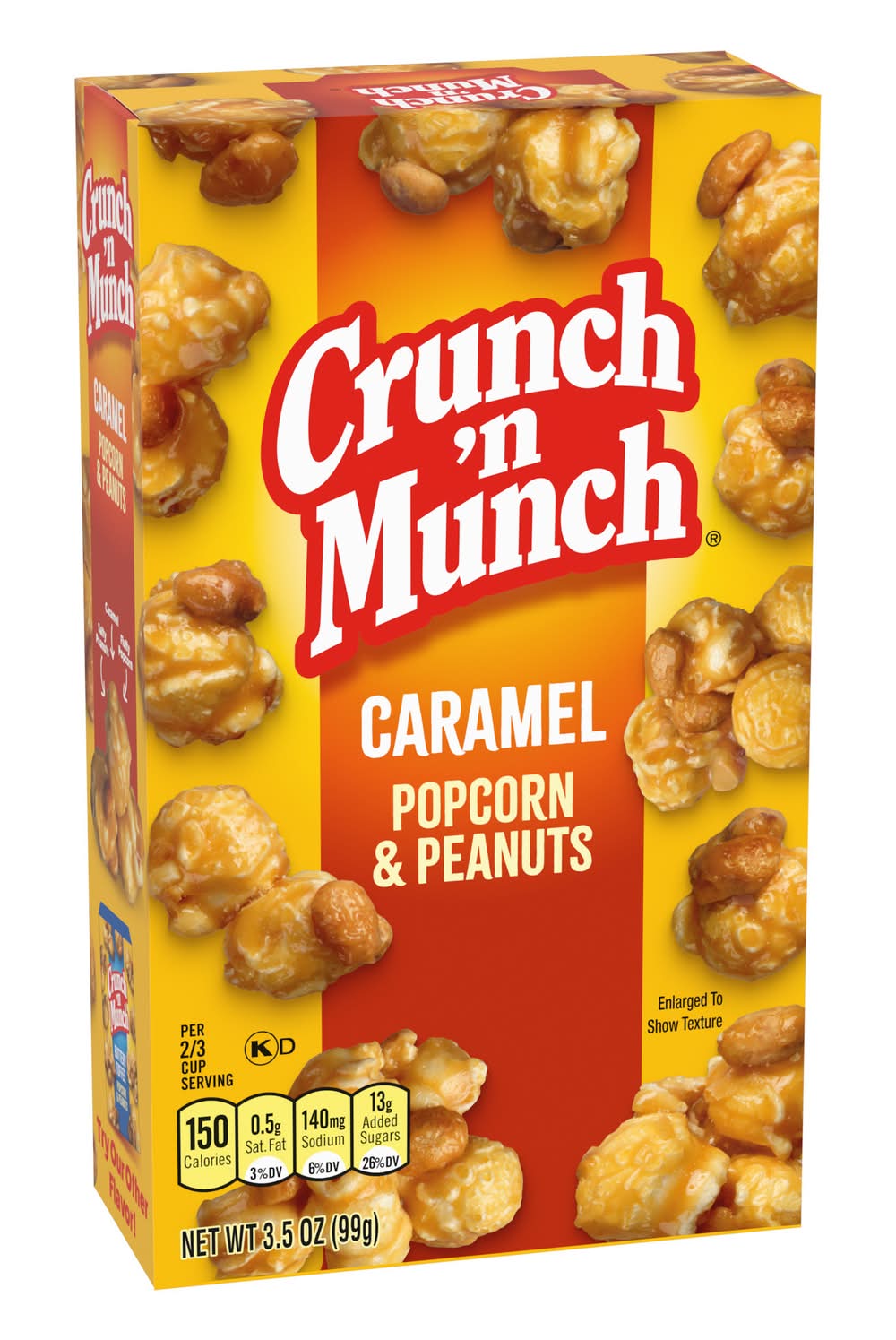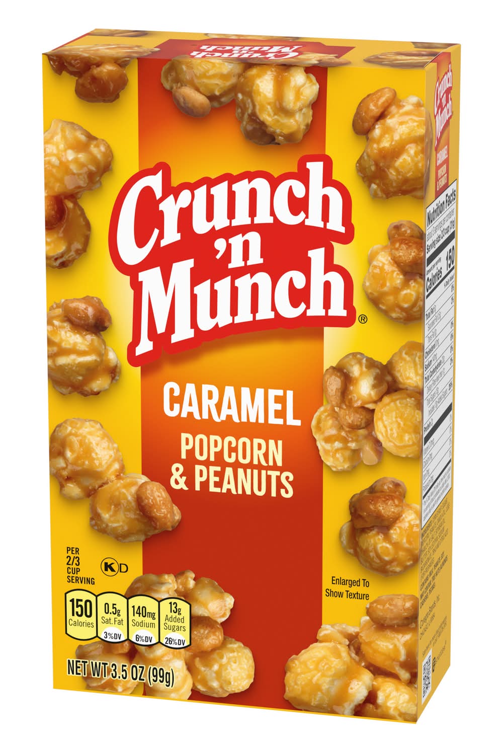 Indulge every craving on-the-go with CRUNCH ‘N MUNCH Caramel Popcorn with Peanuts in a 3.5 ounce box. Whole grain popcorn and crunchy peanuts are covered in decadent caramel and packaged in a portable box so you always have a salty sweet snack on hand. CRUNCH ‘N MUNCH is made with 100% whole grain popcorn. This individual-size package of gourmet popcorn makes the perfect companion for sporting events, road trips and picnics at the park. Enjoy the delicious taste of CRUNCH ‘N MUNCH Caramel Popcorn with Peanuts. • Flavor: Caramel • Conagra brands, PO Box 3534,Chicago,IL,60654 • Packaging: Reusable