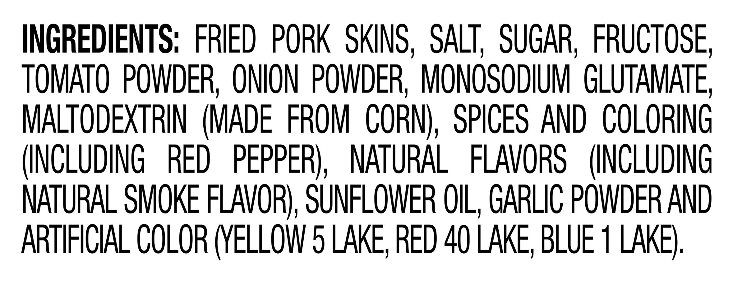 Ingredients: Fried Pork Skins, Salt, Sugar, Fructose, Tomato Powder, Onion Powder, Monosodium Glutamate, Maltodextrin (Made from Corn), Spices and Coloring (Including Red Pepper), Natural Flavors (Including Natural Smoke Flavor), Sunflower Oil, Garlic Powder and Artificial Color (Yellow 5 Lake, Red 40 Lake, Blue 1 Lake) Contains: Corn