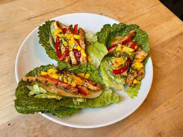 Crisp Romaine Stuffed with Thai Chili Glazed Chicken - Cucumbers - Red Peppers - Mango - Toasted Sesame Seeds - Cilantro. Seasoned Tofu is Available as a Substitution for Chicken.