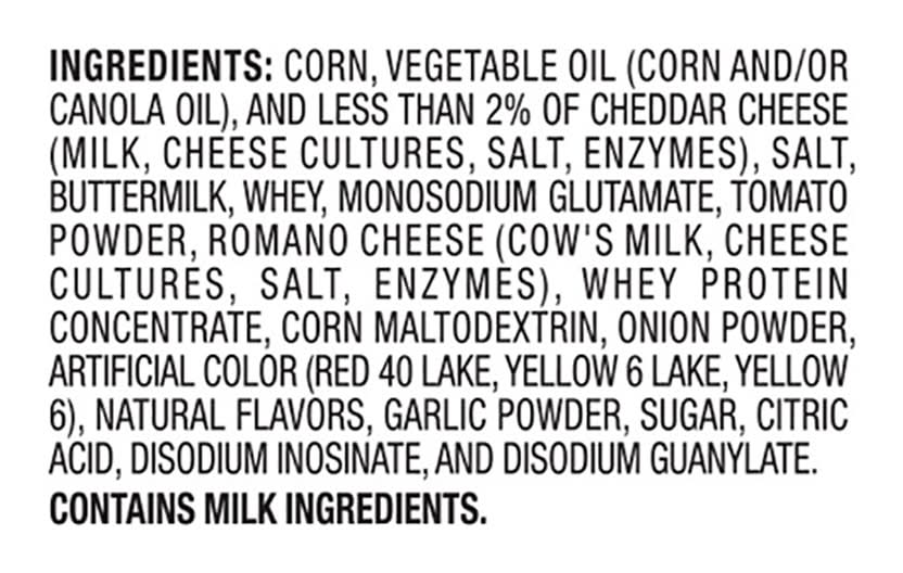 Ingredients: Corn, Vegetable Oil (Corn and/or Canola Oil), and Less than 2% of Cheddar Cheese (Milk, Cheese Cultures, Salt, Enzymes), Salt, Buttermilk, Whey, Monosodium Glutamate, Tomato Powder, Romano Cheese (Cow's Milk, Cheese Cultures, Salt, Enzymes), Whey Protein Concentrate, Corn Maltodextrin, Onion Powder, Artificial Color (Red 40 Lake, Yellow 6 Lake, Yellow 6), Natural Flavors, Garlic Powder, Sugar, Citric Acid, Disodium Inosinate, and Disodium Guanylate Contains: Milk