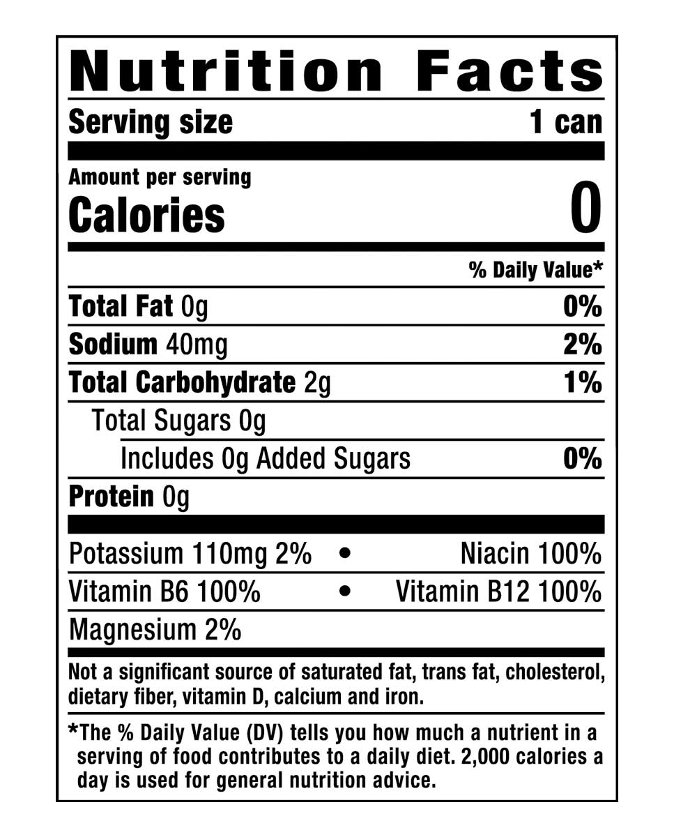 Ingredients: Carbonated Water, Citric Acid (pH Control), Natural Flavors, Essential Amino Acids (L-Leucine, L-Isoleucine, L-Valine, L-Lysine), Caffeine, Sodium Benzoate (Preservative), Sucralose, Potassium Citrate, Potassium Phosphate, Potassium Sorbate (Preservative), Calcium Chloride, Magnesium Chloride, Niacinamide (Vit. B3), Coenzyme Q-10, Pyridoxine Hydrochloride (Vit. B6), Cyanocobalamin (Vit. B12)