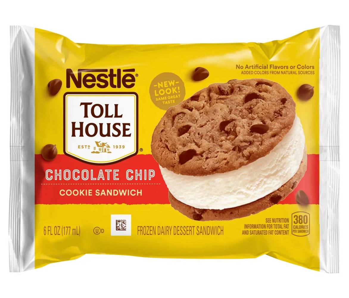 Delicious NESTLE TOLL HOUSE cookies surrounding vanilla frozen dairy dessert. A great homemade tasting treat. Frozen dairy dessert sandwich.