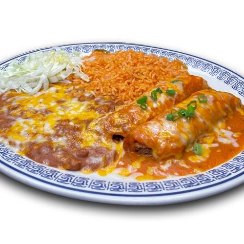 Two Shredded Beef Flautas, topped with relleno sauce and melted cheese, served with rice and beans.