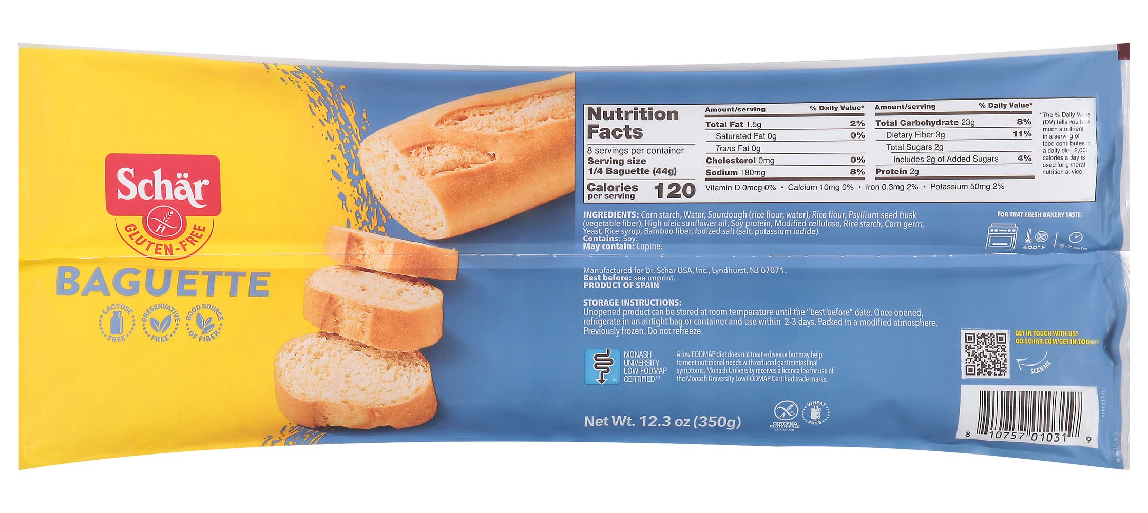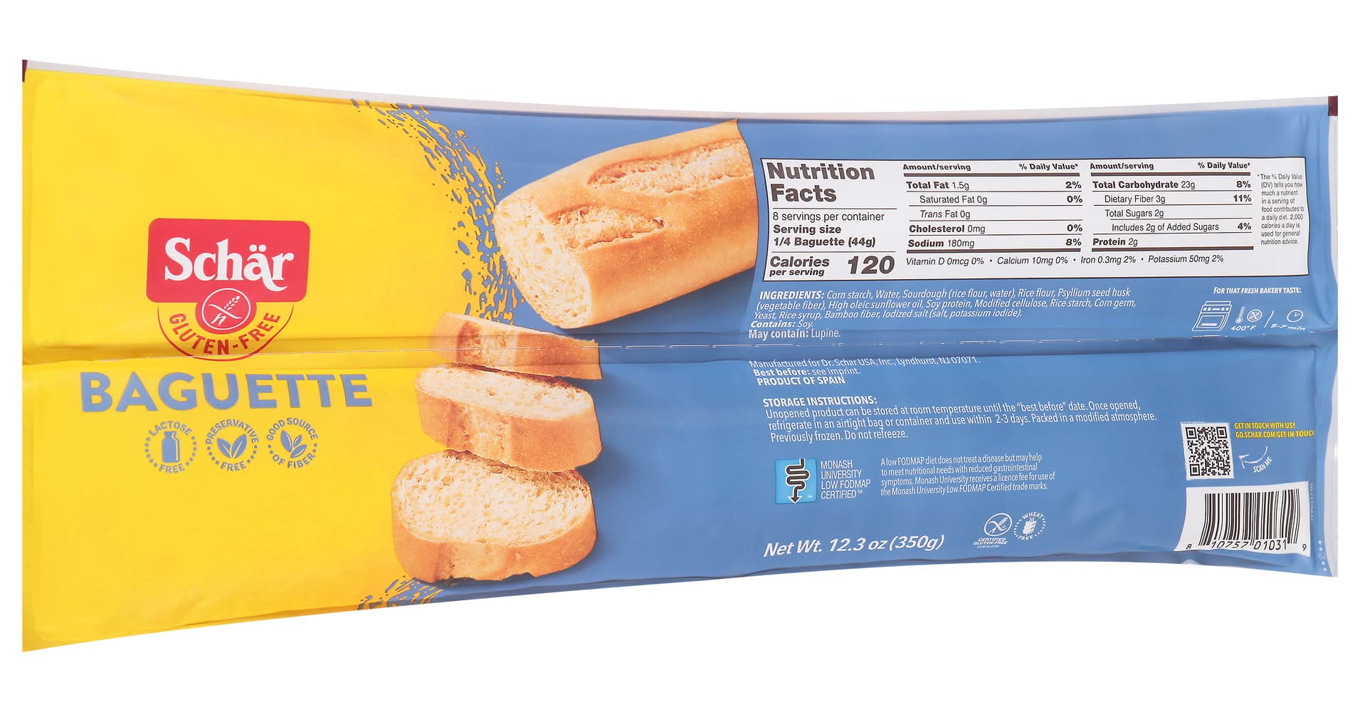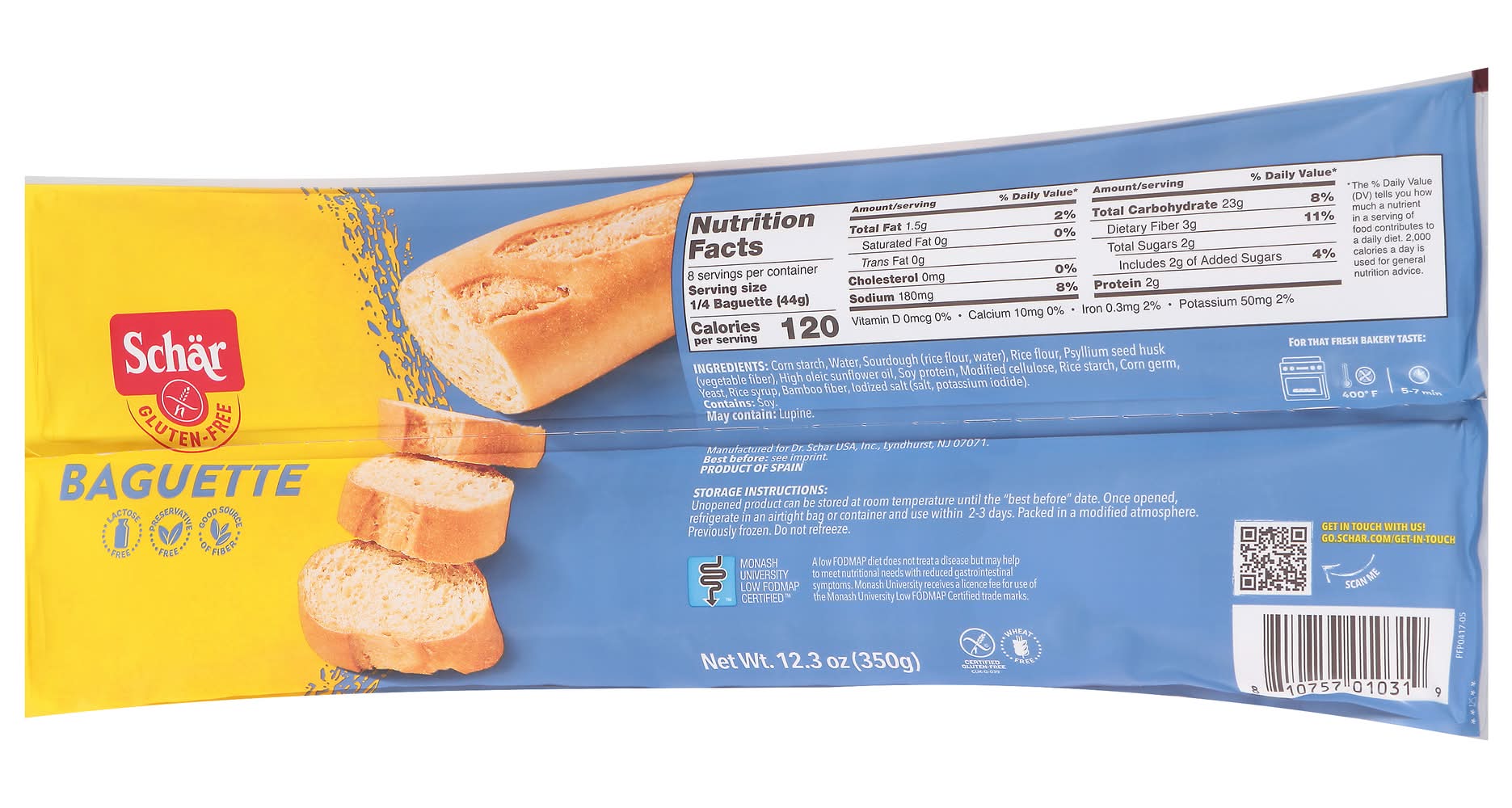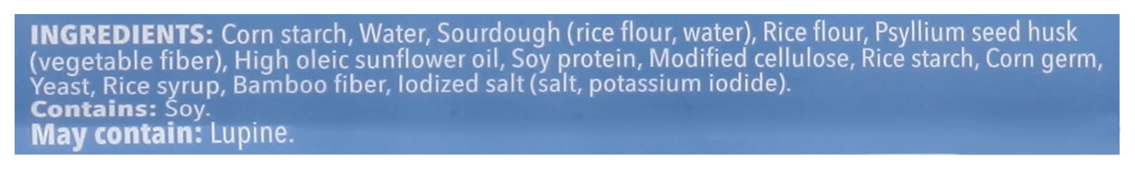 Ingredients: Corn Starch, Water, Sourdough (Rice Flour, Water), Rice Flour, Psyllium Seed Husk (Vegetable Fiber), High Oleic Sunflower Oil, Soy Protein, Modified Cellulose, Rice Starch, Corn Germ, Yeast, Rice Syrup, Bamboo Fiber, Iodized Salt (Salt, Potassium Iodide) Contains: Soybeans