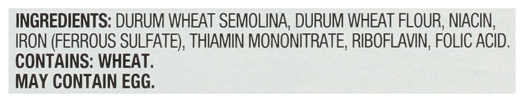 Ingredients: Durum Wheat Semolina, Durum Wheat Flour, Niacin, Iron (Ferrous Sulfate), Thiamin Mononitrate, Riboflavin, Folic Acid Contains: Wheat, Eggs