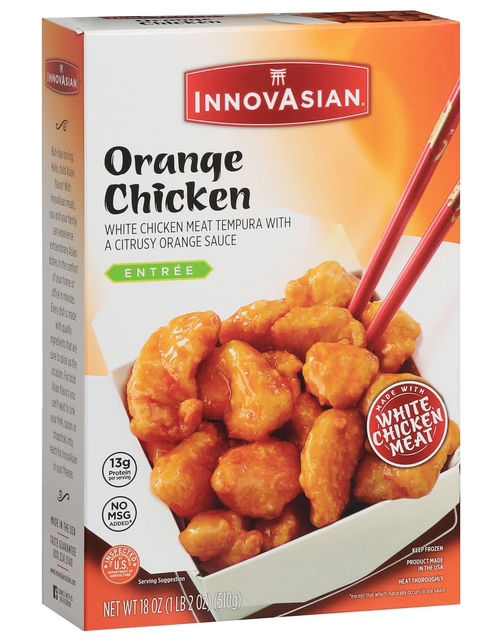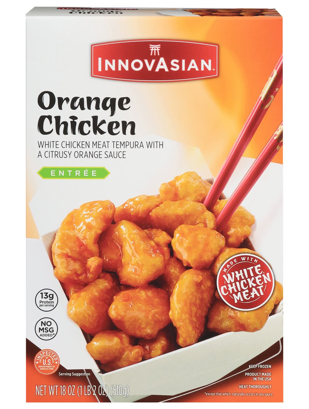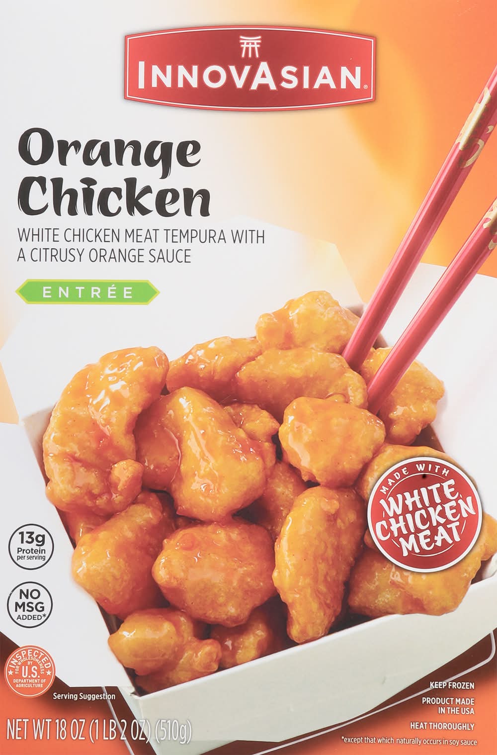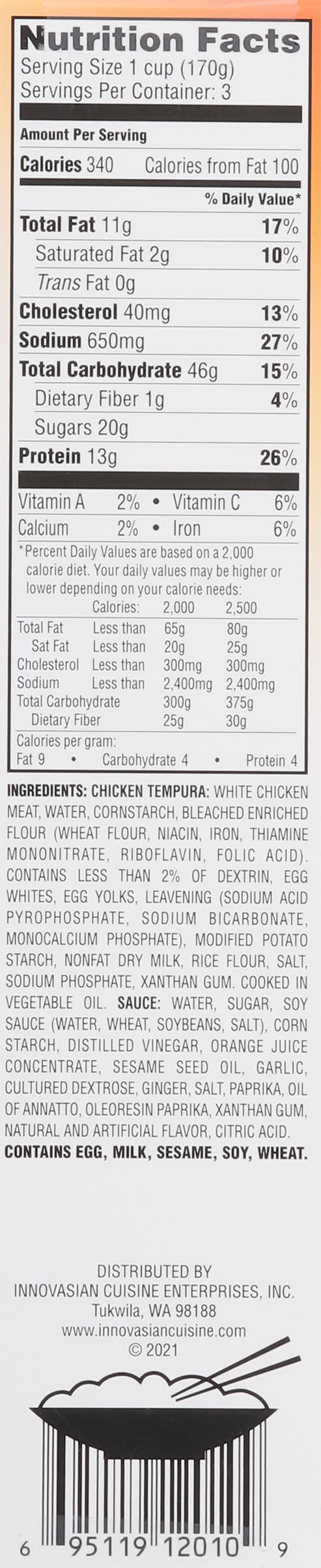 White chicken meat tempura with a citrusy orange sauce. 13 g protein per serving. No msg added (except that which naturally occurs in soy sauce). White chicken meat tempura that rivals your favorite chinese restaurant is tossed with our sweet and tangy orange sauce made with savory soy sauce, orange juice and a hint of sesame oil. Drizzle it with sriracha sauce if you like a little heat, or pair it with our savory wok-style vegetable fried rice. Buh-bye boring. Hello, bold asian flavor! With innovasian meals, you and your family can experience extraordinary asian dishes in the comfort of your home or office in minutes.