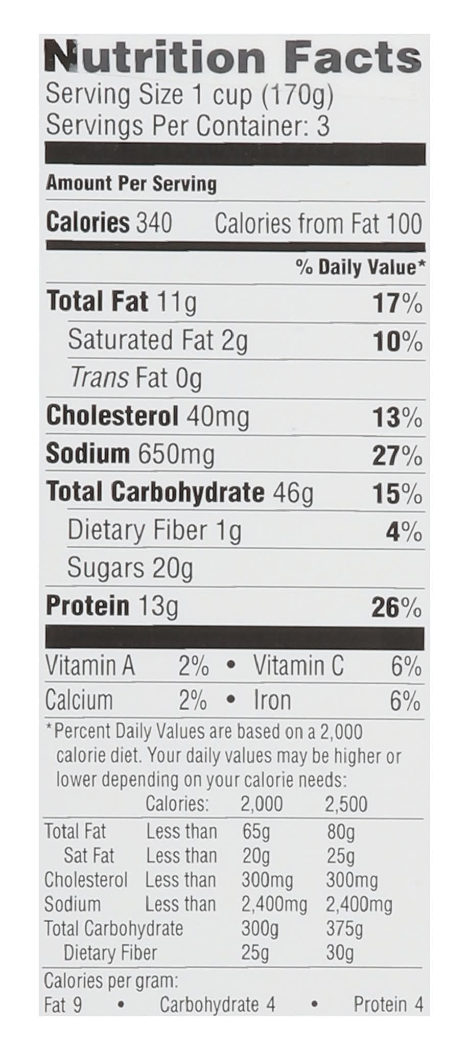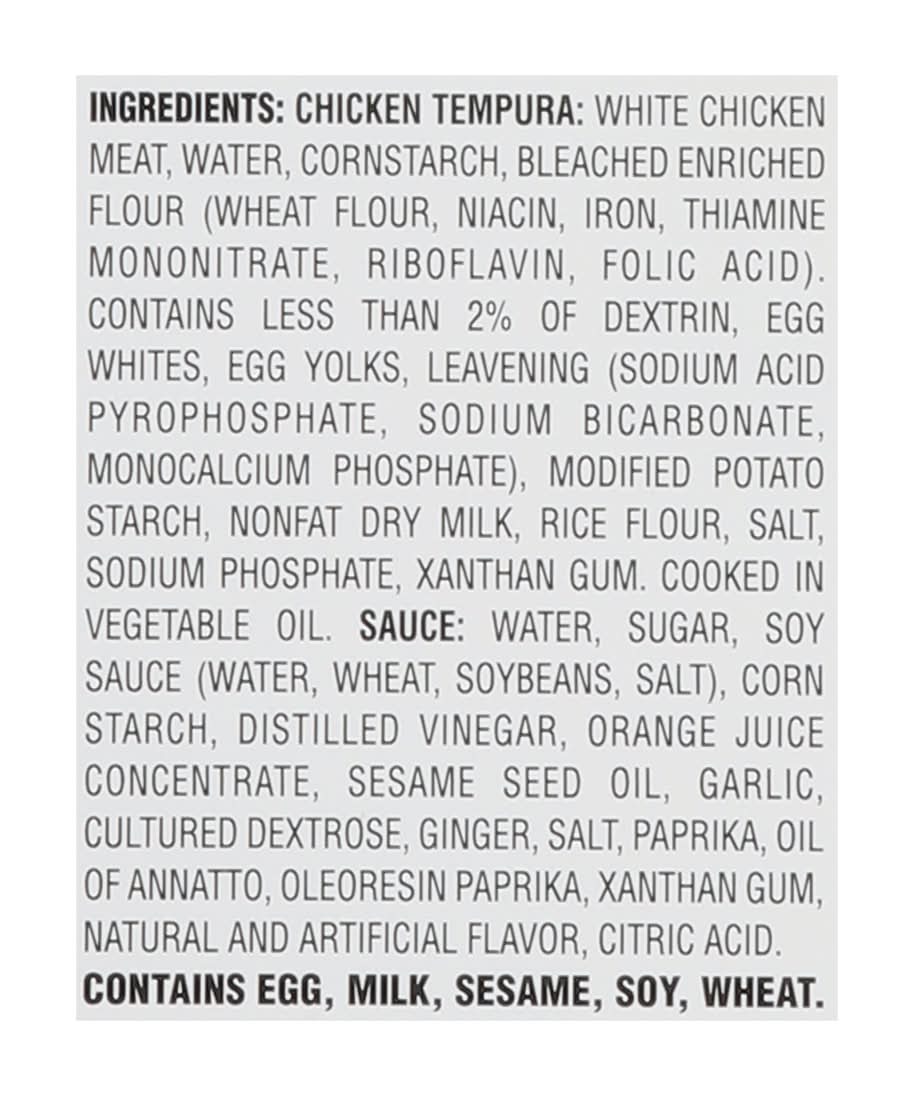 Ingredients: Chicken Tempura: White Chicken Meat, Water, Cornstarch, Bleached Enriched Flour (Wheat Flour Niacin Iron Thiamine Mononitrate Riboflavin Folic Acid). Contains Less than 2% of Dextrin, Egg Whites, Egg Yolks, Leavening (Sodium Acid Pyrophosphate Sodium Bicarbonate Monocalcium Phosphate), Modified Potato Starch, Nonfat Dry Milk, Rice Flour, Salt, Sodium Phosphate, Xanthan Gum. Cooked in Vegetable Oil. Sauce: Water, Sugar, Soy Sauce (Water Wheat Soybeans Salt), Corn Starch, Distilled Vinegar, Orange Juice Concentrate, Sesame Seed Oil, Garlic, Cultured Dextrose, Ginger, Salt, Paprika, Oil of Annatto, Oleoresin Paprika, Xanthan Gum, Natural and Artificial Flavor, Citric Acid Contains: Eggs, Milk, Sesame, Soybeans, Wheat, Corn