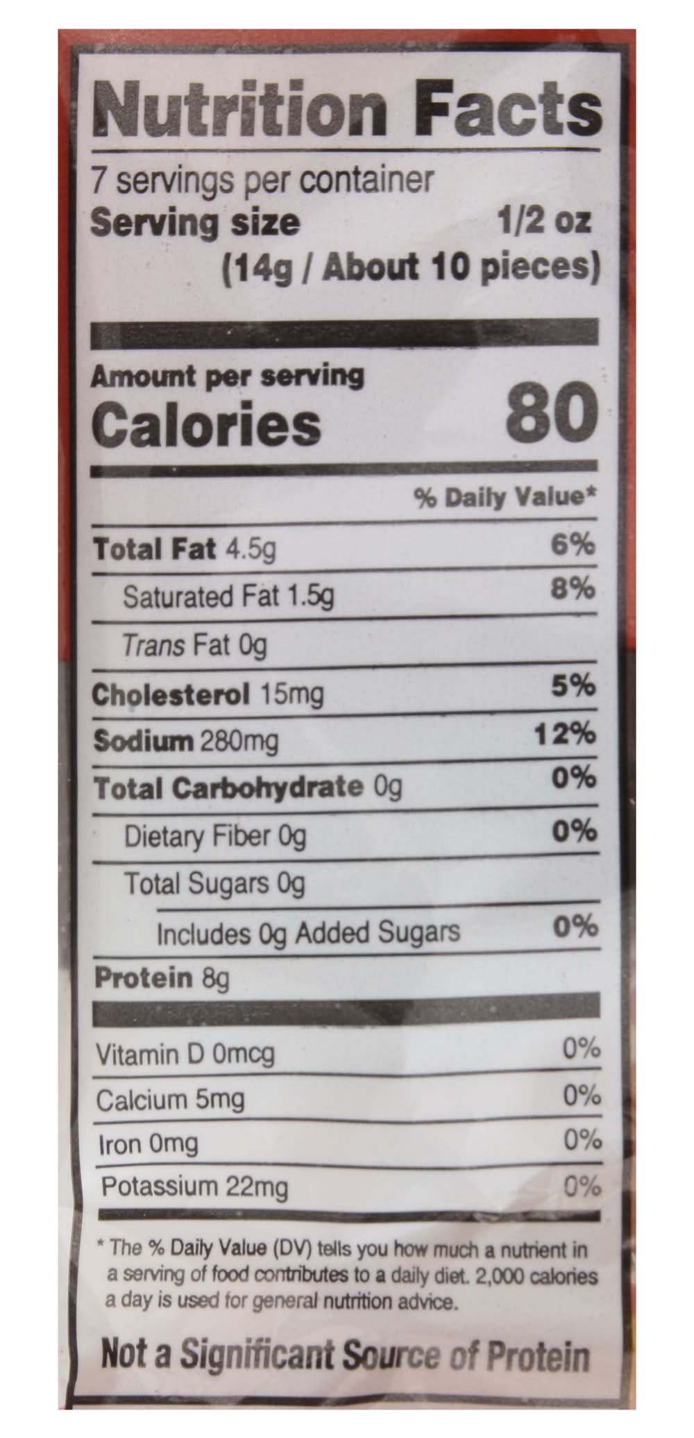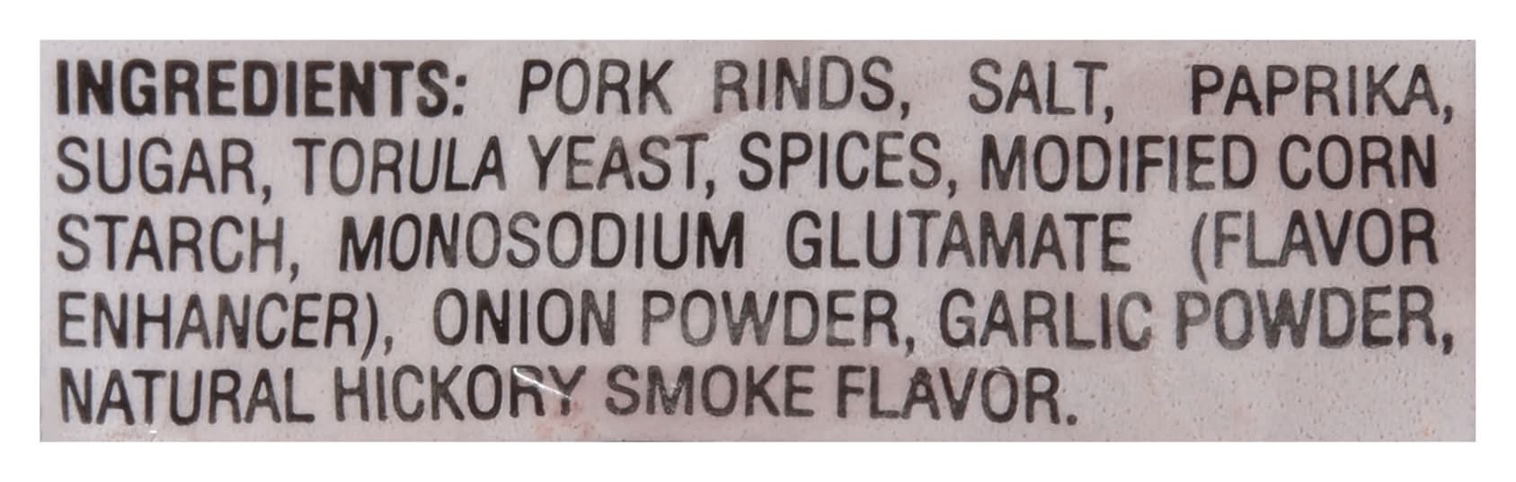 Ingredients: Pork Rinds, Salt, Paprika, Sugar, Torula Yeast, Spices, Modified Corn Starch, Monosodium Glutamate (Flavor Enhancer), Onion Powder, Garlic Powder, Natural Hickory Smoke Flavor Contains: Corn, Tree Nuts, Hickory Nuts