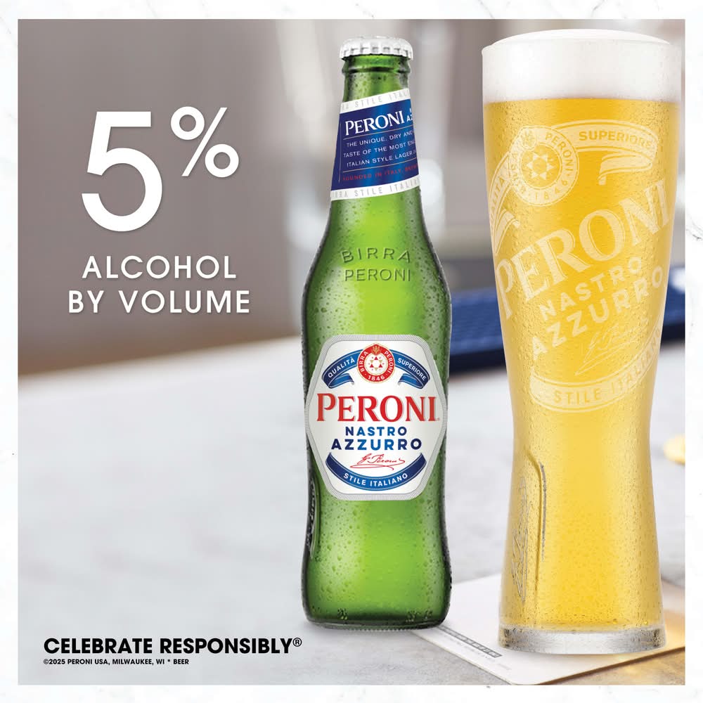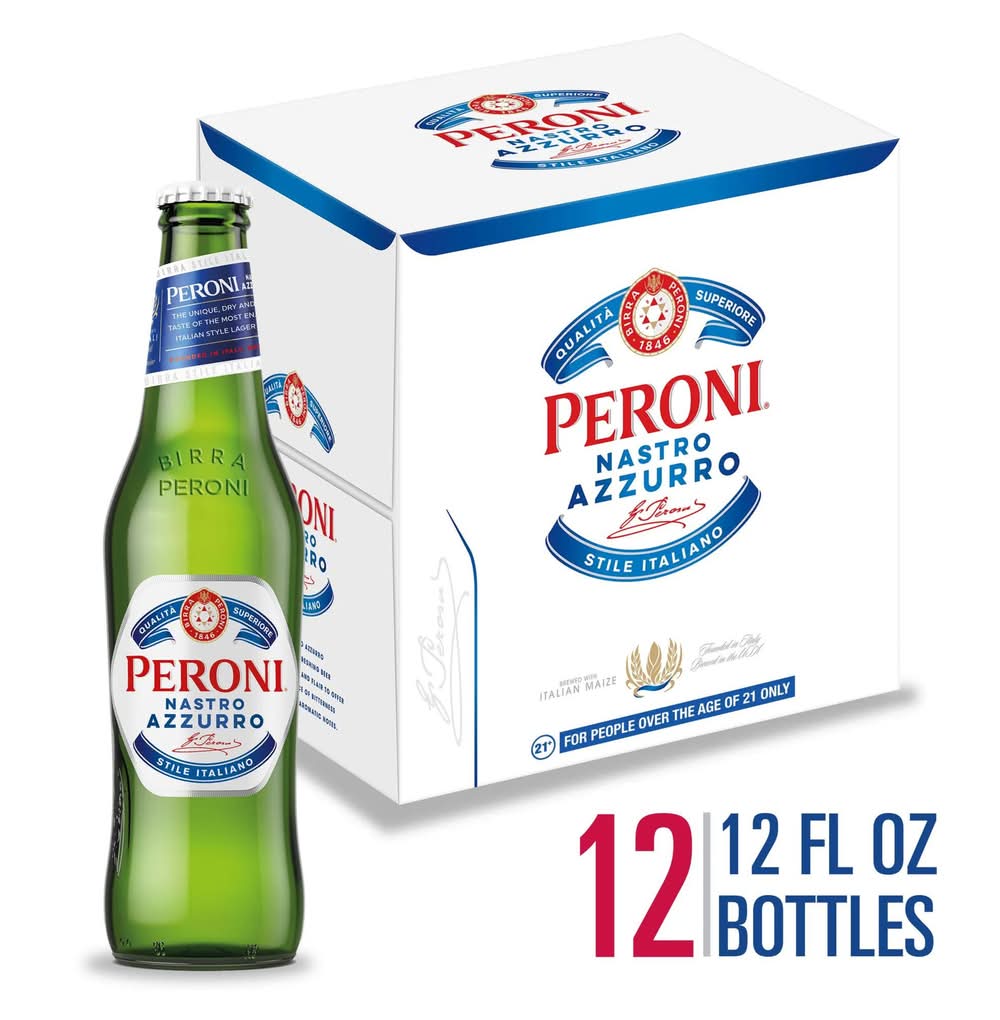 Enjoy Peroni Nastro Azzurro, a refined beer with a distinctive crisp and refreshing taste. Founded in Italy and brewed in the USA with superior quality, this exceptionally dry, medium-bodied lager features citrus, rye toast and delicate spice notes . Deliciously effervescent, this inspiring adult beverage is the top premium Italian beer brand in the world. It makes the perfect accompaniment to the flavorful foods of the Mediterranean and beyond. Pairs well with appetizers and Italian cuisine and can be enjoyed at a cocktail bar, on the rooftop or anytime you want to celebrate life with passion and flair. Get Live every moment with Peroni Nastro Azzurro. • Pack size: 12 • Alcohol by volume: 0.05% • Birra Peroni Internazionale, Washington,DC,20005 • Packaging: Reusable