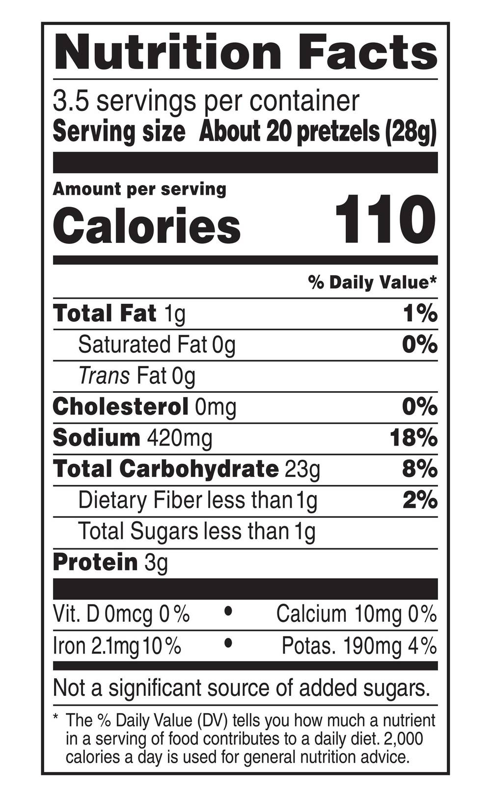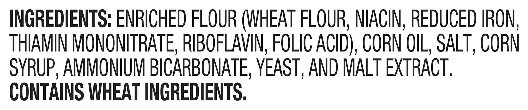 Ingredients: Enriched Flour (Wheat Flour, Niacin, Reduced Iron, Thiamin Mononitrate, Riboflavin, Folic Acid), Corn Oil, Salt, Corn Syrup, Ammonium Bicarbonate, Yeast, and Malt Extract Contains: Wheat