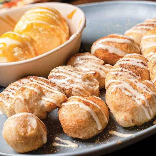 Freshly baked cinnamon and sugar bites drizzled with vanilla and topped with ice cream and caramel.