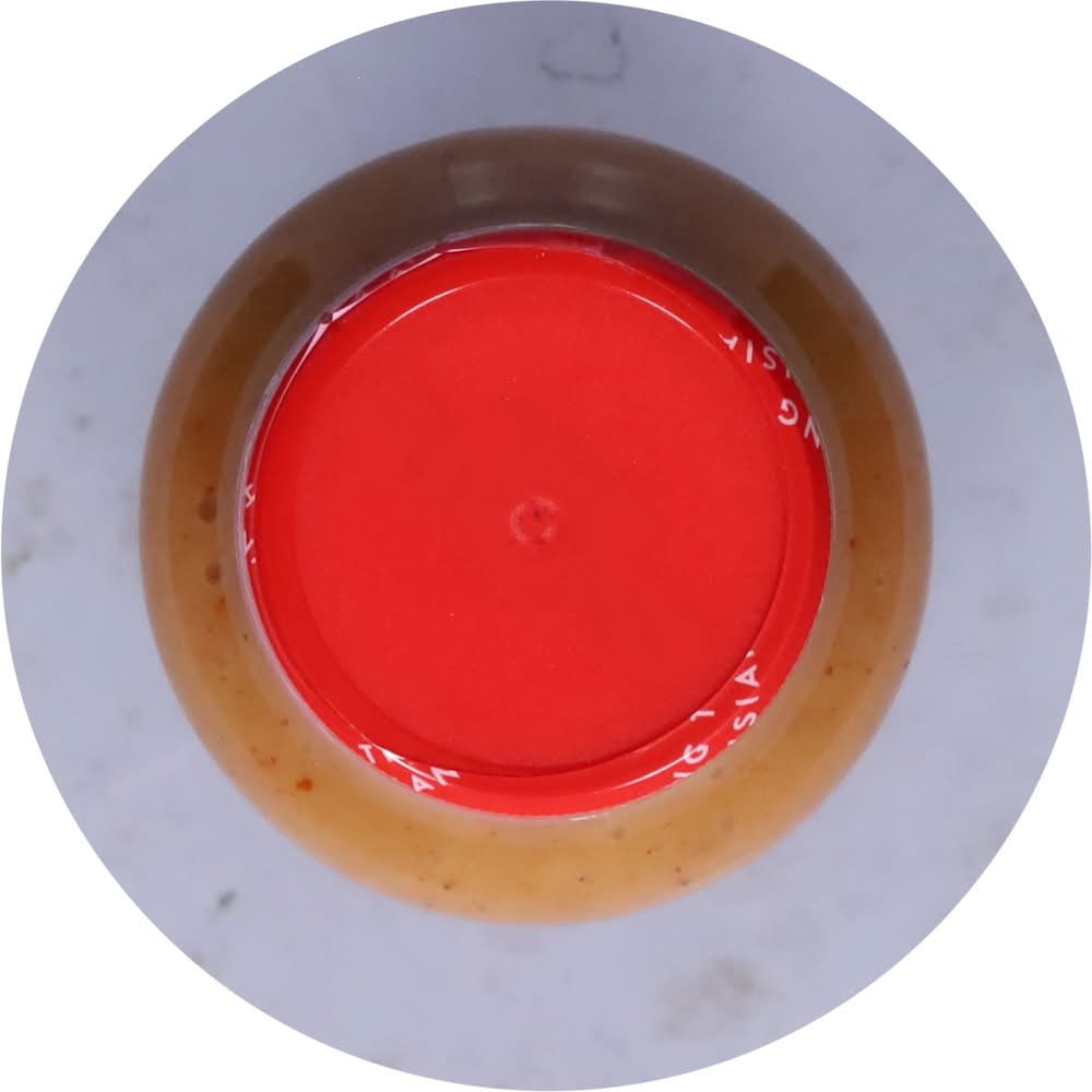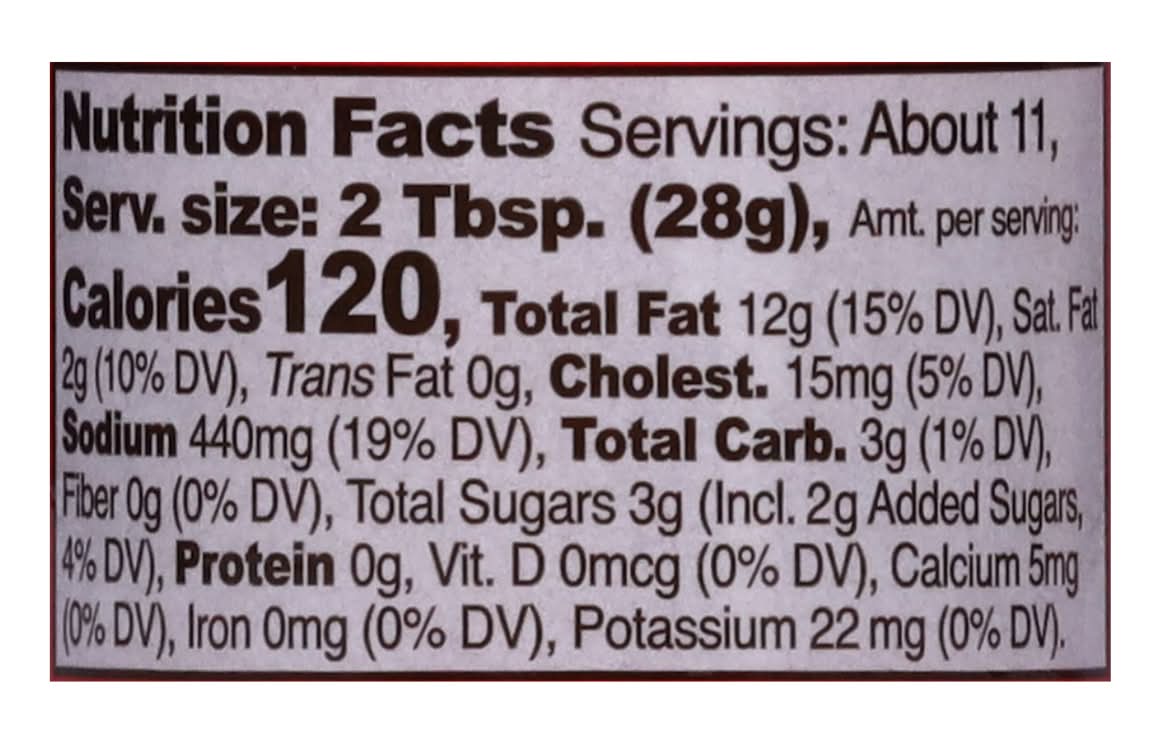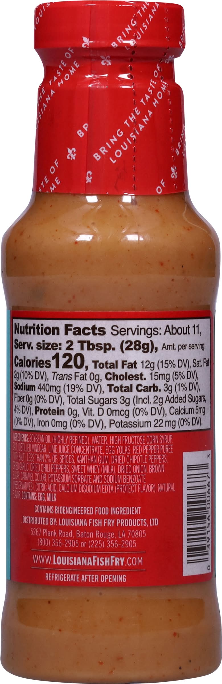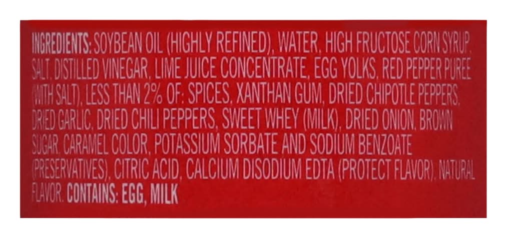 Ingredients: Soybean Oil (Highly Refined), Water, High Fructose Corn Syrup, Salt, Distilled Vinegar, Lime Juice Concentrate, Egg Yolks, Red Pepper Puree (with Salt), Less than 2% of: Spices, Xanthan Gum, Dried Chipotle Peppers, Dried Garlic, Dried Chili Peppers, Sweet Whey (Milk), Dried Onion, Brown Sugar, Caramel Color, Potassium Sorbate and Sodium Benzoate (Preservatives), Citric Acid, Calcium Disodium EDTA (Protect Flavor), Natural Flavor Contains: Eggs, Milk, Soybeans