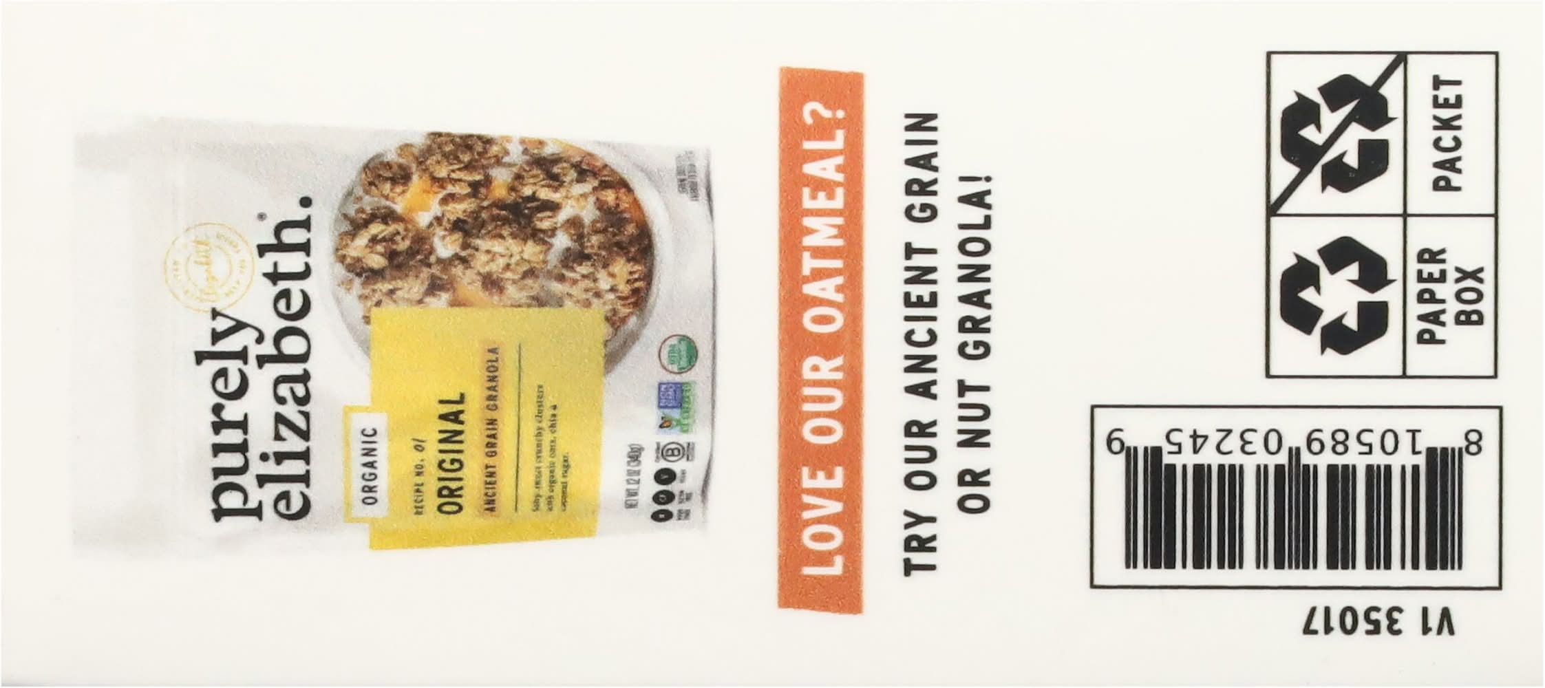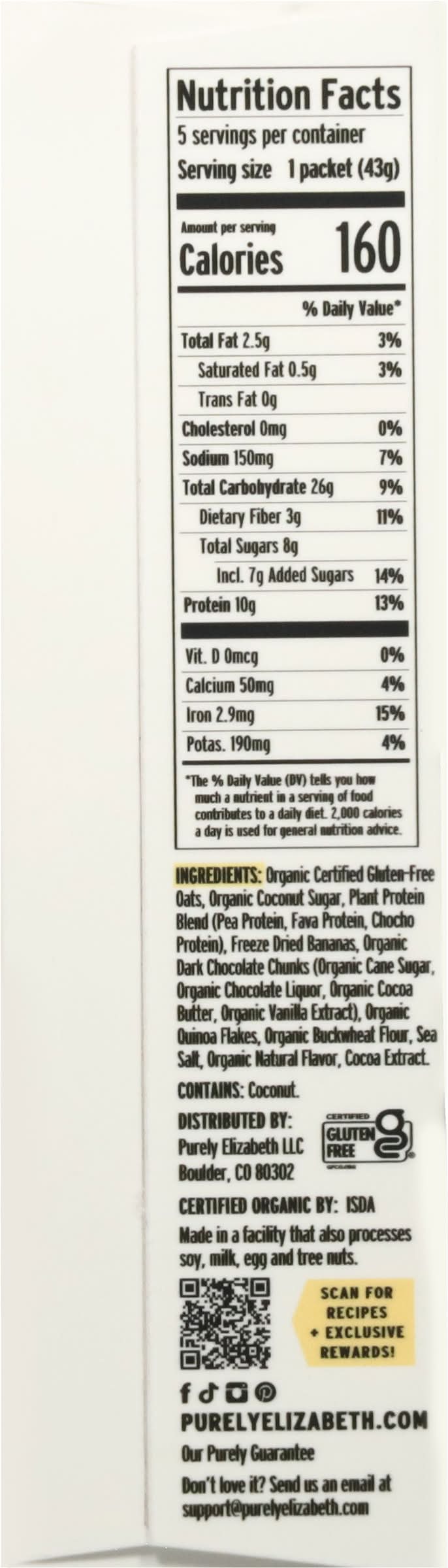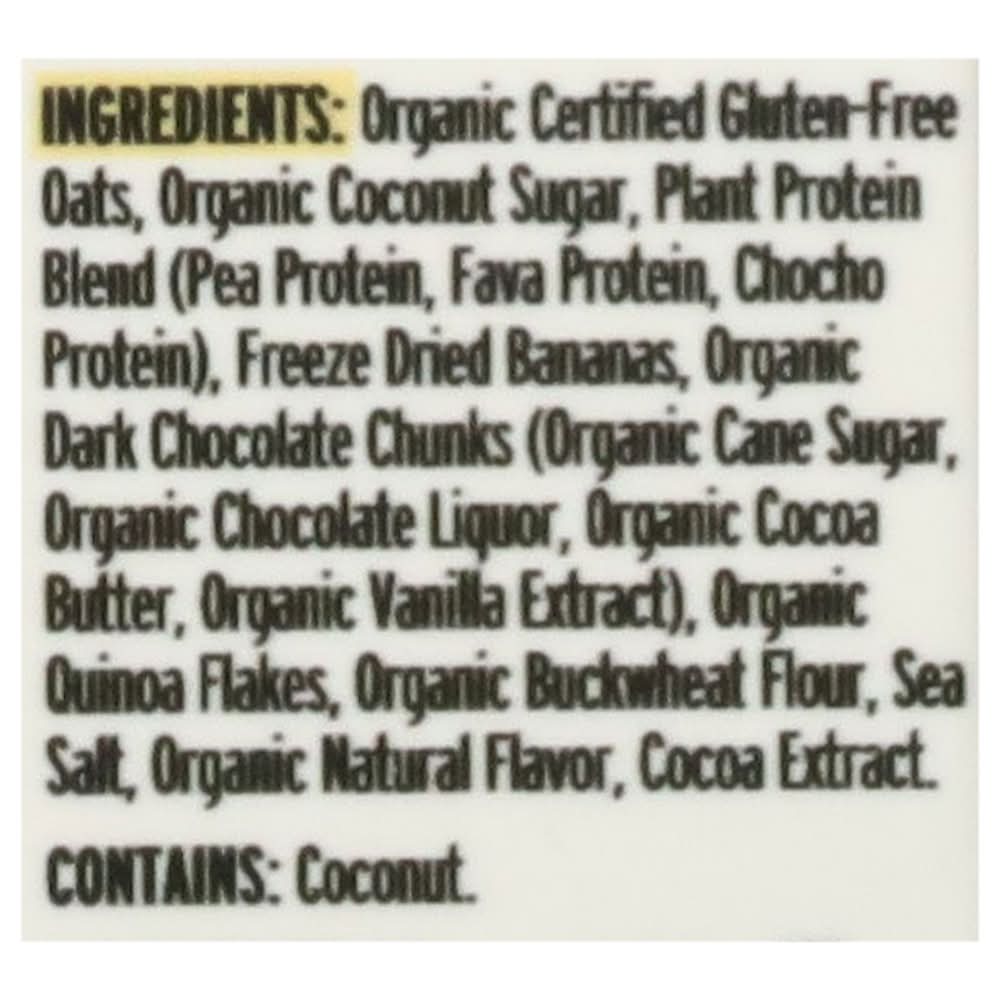 Ingredients: Organic Certified Gluten-Free Oats, Organic Coconut Sugar, Plant Protein Blend (Pea Protein, Fava Protein, Chocho Protein), Freeze Dried Bananas, Organic Dark Chocolate Chunks (Organic Cane Sugar, Organic Chocolate Liquor, Organic Cocoa Butter, Organic Vanilla Extract), Organic Quinoa Flakes, Organic Buckwheat Flour, Sea Salt, Organic Natural Flavor, Cocoa Extract Contains: Oat, Tree Nuts, Coconuts, Soybeans, Milk, Eggs, Tree Nuts
