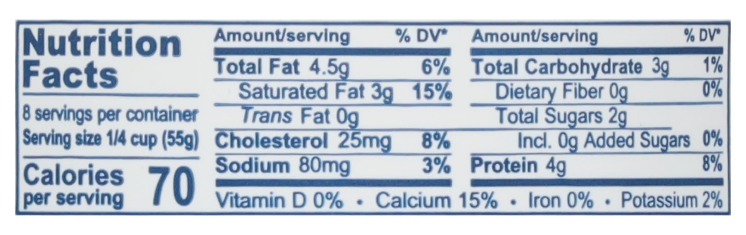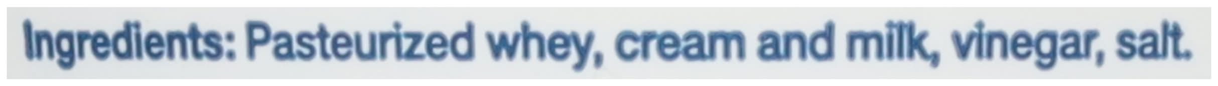 Ingredients: Pasteurized Whey, Cream and Milk, Vinegar, Salt Contains: Milk