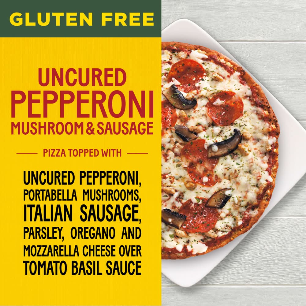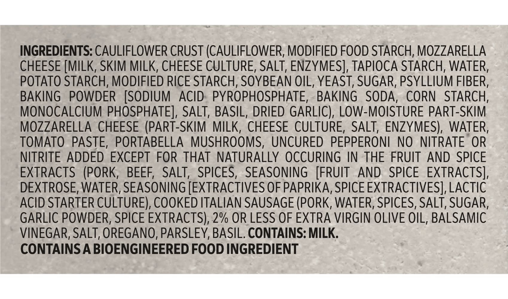 Ingredients: CAULIFLOWER CRUST (CAULIFLOWER, MODIFIED FOOD STARCH, MOZZARELLA CHEESE [MILK, SKIM MILK, CHEESE CULTURE, SALT, ENZYMES], TAPIOCA STARCH, WATER, POTATO STARCH, MODIFIED RICE STARCH, SOYBEAN OIL, YEAST, SUGAR, PSYLLIUM FIBER, BAKING POWDER [SODIUM ACID PYROPHOSPHATE, BAKING SODA, CORN STARCH, MONOCALCIUM PHOSPHATE], SALT, BASIL, DRIED GARLIC), LOW-MOISTURE PART-SKIM MOZZARELLA CHEESE (PART-SKIM MILK, CHEESE CULTURE, SALT, ENZYMES), WATER, TOMATO PASTE, PORTABELLA MUSHROOMS, UNCURED PEPPERONI NO NITRATE OR NITRITE ADDED EXCEPT FOR THAT NATURALLY OCCURING IN THE FRUIT AND SPICE EXTRACTS (PORK, BEEF, SALT, SPICES, SEASONING [FRUIT AND SPICE EXTRACTS], DEXTROSE, WATER, SEASONING [EXTRACTIVES OF PAPRIKA, SPICE EXTRACTIVES], LACTIC ACID STARTER CULTURE), COOKED ITALIAN SAUSAGE (PORK, WATER, SPICES, SALT, SUGAR, GARLIC POWDER, SPICE EXTRACTS), 2% OR LESS OF EXTRA VIRGIN OLIVE OIL, BALSAMIC VINEGAR, SALT, OREGANO, PARSLEY, BASIL. Contains: CONTAINS: MILK.