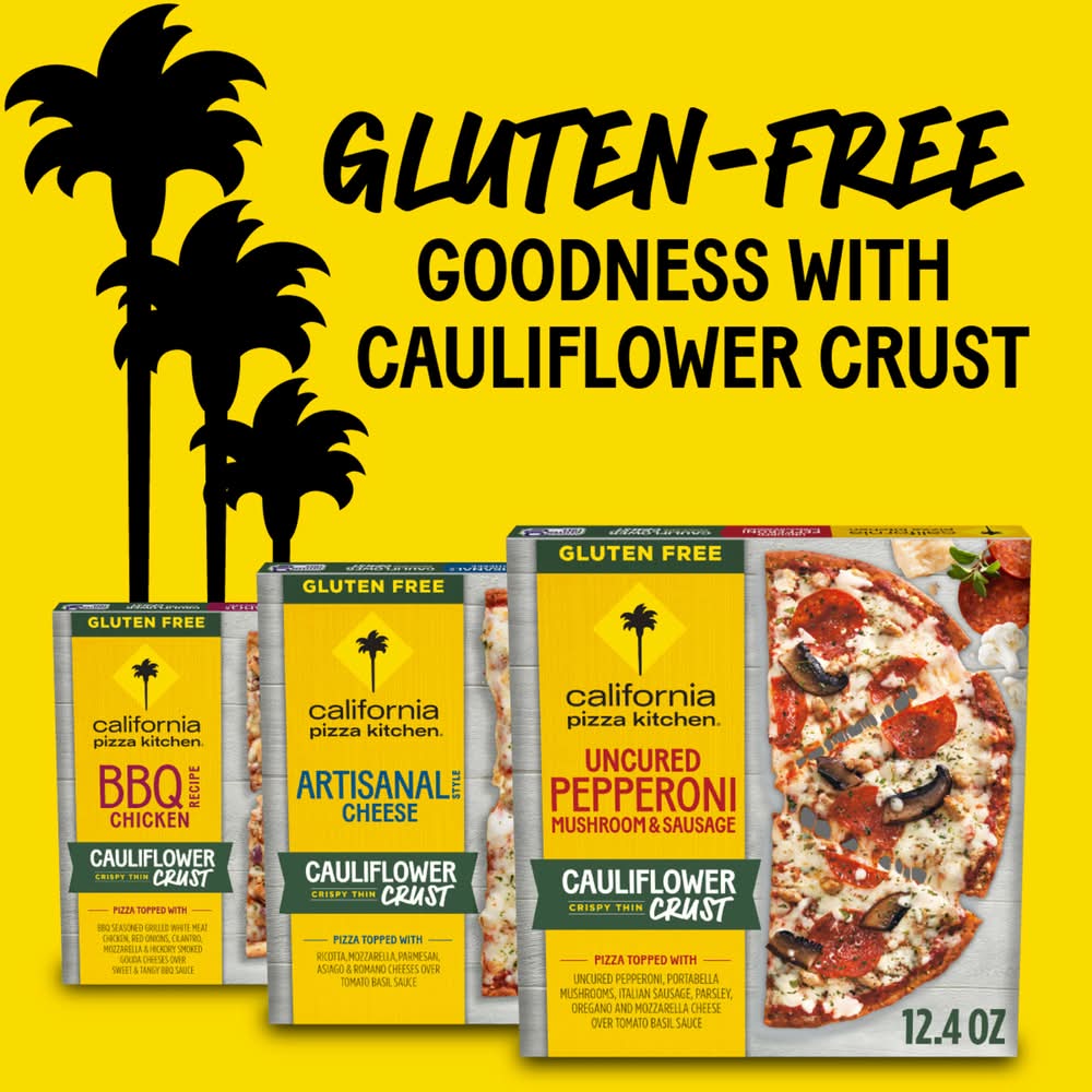 This expertly crafted California Pizza Kitchen Uncured Pepperoni, Mushroom and Sausage Pizza with a cauliflower crust delivers exceptional taste with premium ingredients – including 100% real cheese and a gluten free crust. We’re always exploring new flavors and searching for the best; from premium toppings down to a dough that delivers the perfect taste and texture. Our thoughtfully crafted recipes and passion for quality are at the core of every delicious frozen pizza we offer, and this sausage and pepperoni pizza is no exception. Our gluten free pizza is baked with premium ingredients. We start with a cauliflower crust, covered in a tomato basil sauce, topped with uncured pepperoni, portabella mushrooms, Italian sausage, parsley, oregano, and mozzarella cheese. To top it all off, it’s easy to make! Bake a restaurant style sausage and pepperoni pizza in only 16 minutes. For those who approach food with mindfulness and an adventurous spirit, we hope you just found a new favorite homemade pizza – from our kitchen to yours.