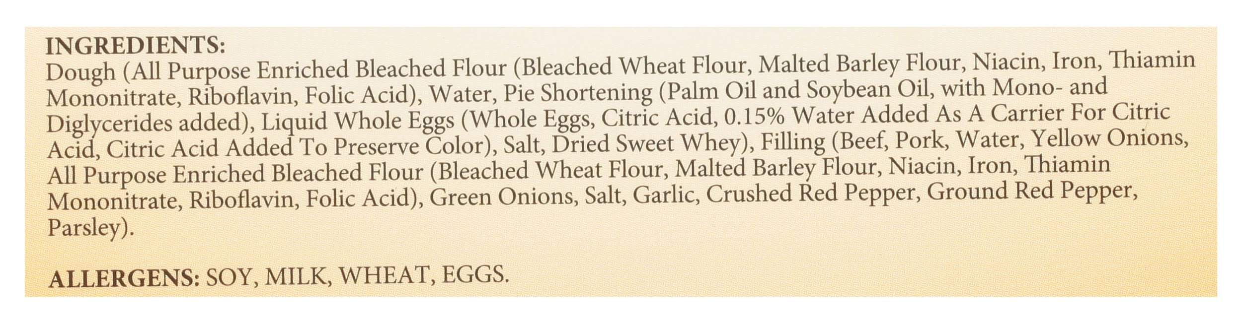 Ingredients: Dough (All Purpose Enriched Bleached Flour (Bleached Wheat Flour, Malted Barley Flour, Niacin, Iron, Thiamin Mononitrate, Riboflavin, Folic Acid), Water, Pie Shortening (Palm Oil and Soybean Oil, with Mono- and Diglycerides Added), Liquid Whole Eggs (Whole Eggs, Citric Acid, 0.15% Water Added as a Carrier for Citric Acid, Citric Acid Added to Preserve Color), Salt, Dried Sweet Whey), Filling (Beef, Pork, Water, Yellow Onions, All Purpose Enriched Bleached Flour (Bleached Wheat Flour, Malted Barley Flour, Niacin, Iron, Thiamin Mononitrate, Riboflavin, Folic Acid), Green Onions, Salt, Garlic, Crushed Red Pepper, Ground Red Pepper, Parsley) Contains: Soybeans, Milk, Wheat, Eggs, Barley