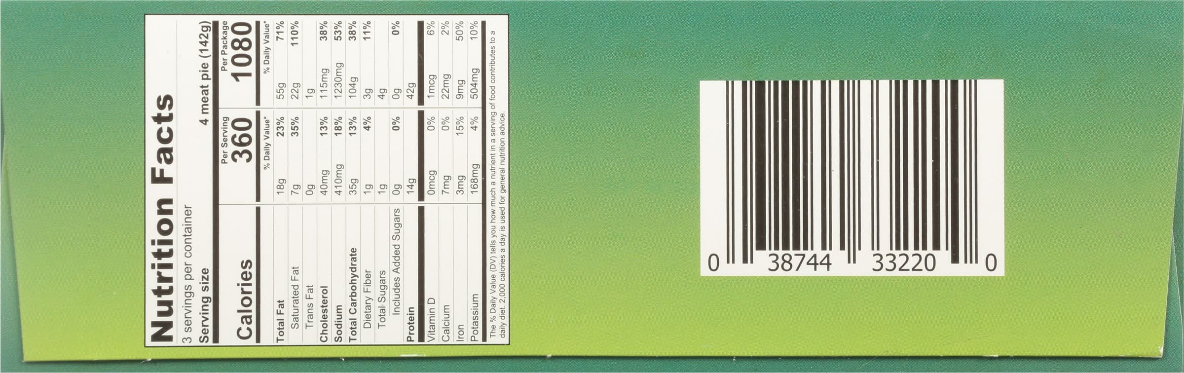 Directions for use: Cooking Instructions: Deep Frying: Fill skillet with enough oil to fully cover pies. Preheat oil to 375 degrees. Cook for 5 to 6 minutes. Drain on absorbent paper. Conventional Oven: Preheat oven to 400 degrees. Place pies on oiled cookie sheet. Brush pies with melted margarine or butter. Bake for 25 minutes. Allow to cool for 2 minutes before eating. Cooking Note: Cook until internal temperature reaches equal to or greater than 158 degrees F. Always prepare from frozen state. Product not recommended for microwavable use. Product must be fully cooked. Keep frozen. Storage recommendation: Keep frozen.