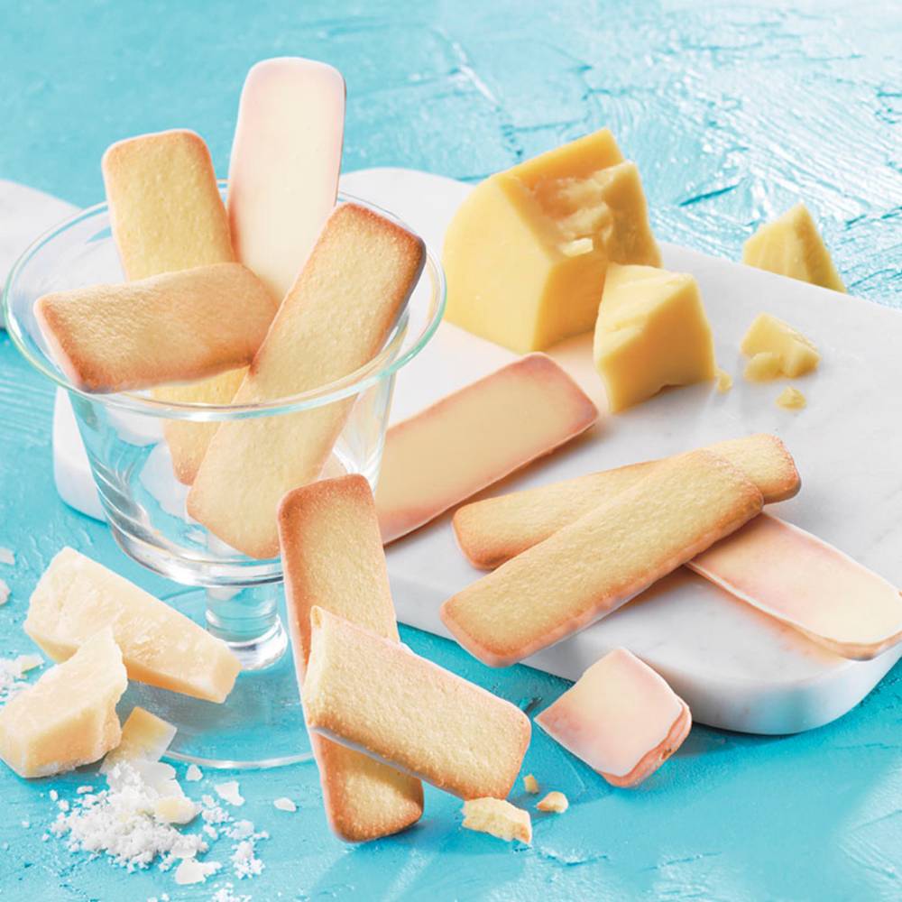 This selection has baton-shaped coconut cookies made with a cookie dough mixed with Parmesan and Gouda cheeses. Each cookie is coated with white chocolate on one side. 25 pieces inside.Allergens: Wheat, Egg, Milk, Soy, Tree Nut (Coconut)Storage Temp: 77°F
