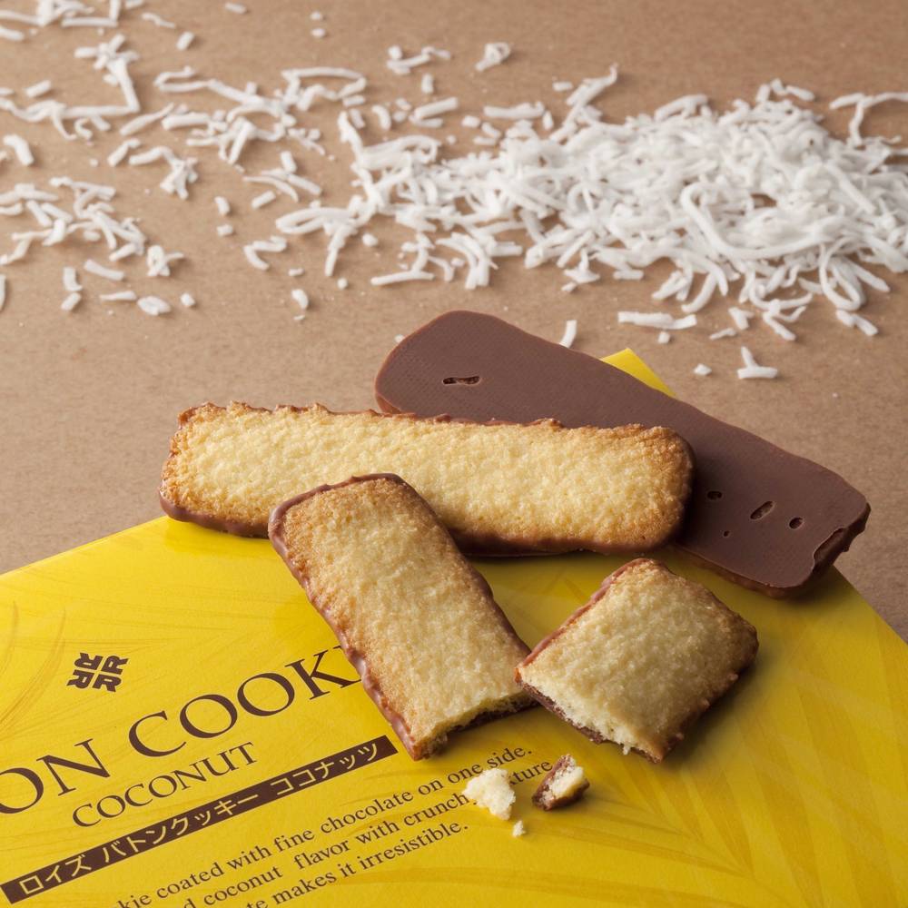 This selection has golden-baked coconut cookies coated with chocolate on one side. 25 pieces inside. Allergens: Wheat, Egg, Milk, Soy, Coconut