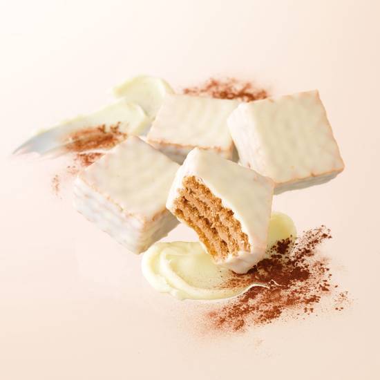 An elegant harmony of coffee and mascarpone cream wafers coated in moderately sweet white chocolate. 12 pieces per package. Allergens: Wheat, milk, soy