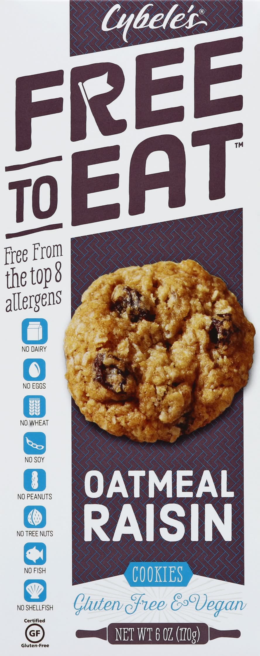 Free to eat. Free from the Top 8 Allergens: no dairy; no eggs; no wheat; no soy; no peanuts; no tree nuts; no fish; no shellfish. Certified gluten-free. Say hello to the modern cookie. Full of the flavors you crave and free from the top 8 allergens. When my son was diagnosed with severe food allergies, I tied on my apron and began baking from scratch. Now you can try our favorite allergy-friendly cookies, baked fresh for you. They're made with all-natural, vegan ingredients and no preservatives or additives. They're also gluten-free, sesame-free, and sulfite-free. And because your safety is so important to us, all our ingredient suppliers have been carefully screened to avoid cross contamination risk. Now my cookies are your cookies. In addition, thousands of (hashtag)FreeFrom advocates are sharing lifestyle tips everyday at CybelePascal.com. and CybelesFreeToEat.com. You are now free-to-eat! Enjoy! - Cybele Pascal, The Allergy-Friendly Cook. Baked in a dedicated gluten-free, allergy-friendly facility. Certified vegan. vegan.org. Free to Eat, Los Angeles, CA