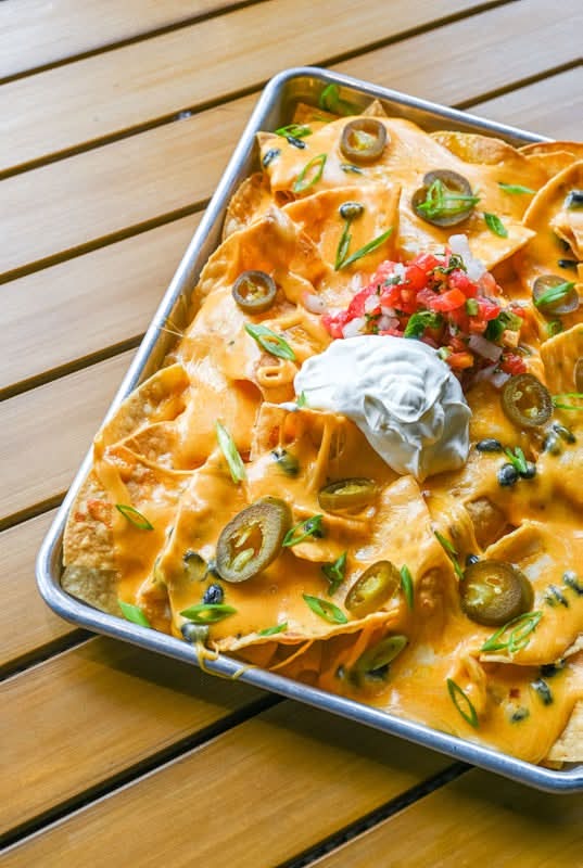 Corn tortillas chips tucked under our signature Cheddar and Velveeta "cheese blanket." topped with salsa grilled chicken, black beans served with pico de gallo, jalapenos, sour cream and scallions