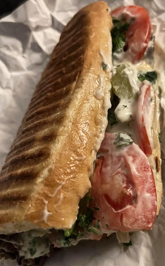 Beef shawarma style with sauteed onions garlic sauce, tomatoes, parsley, and pickles on a toasted hoagie roll.