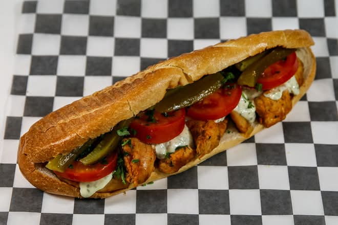 Grilled chicken with sauteed onions, garlic sauce, tomatoes, parsley, and pickles on a toasted hoagie roll.