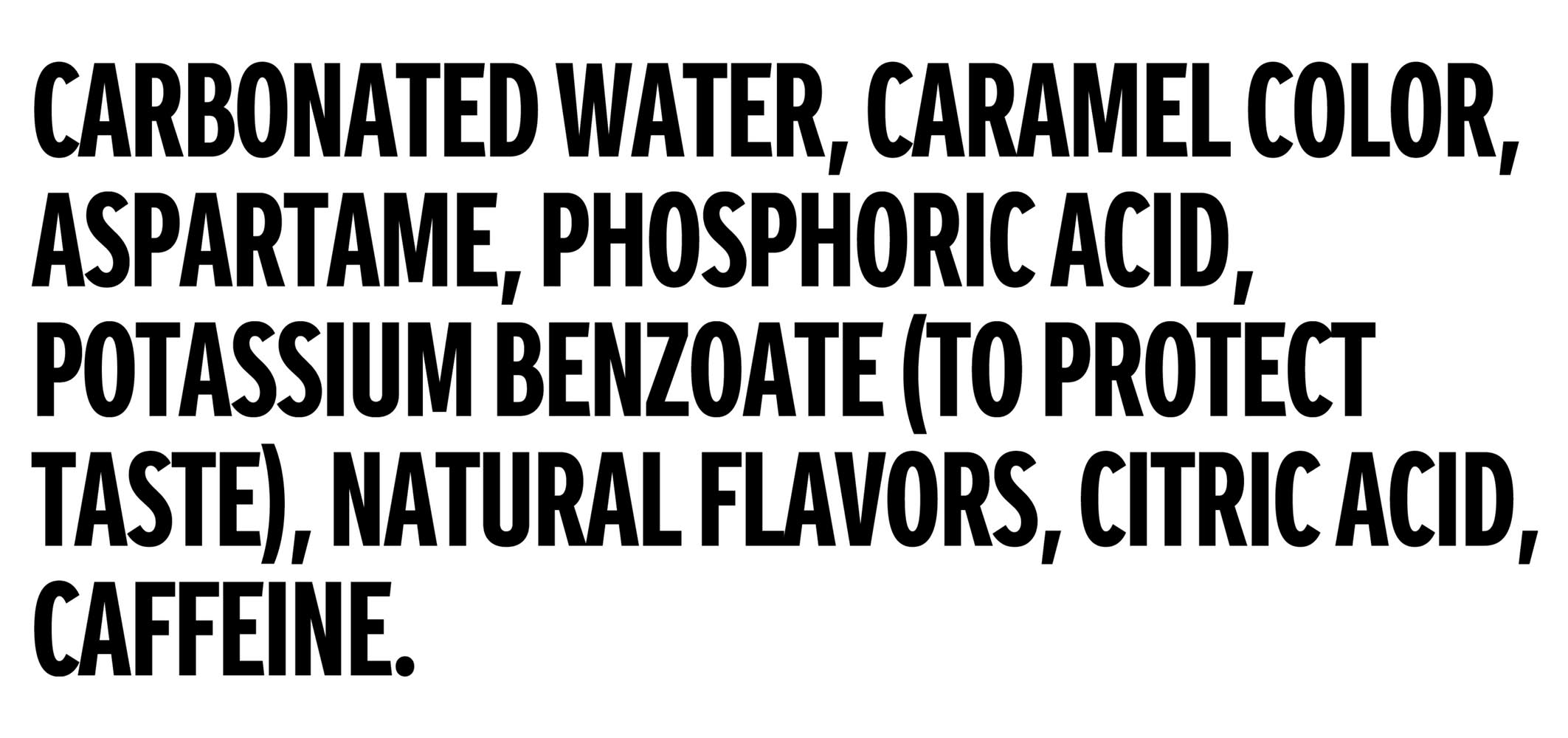 Ingredients: Carbonated Water, Caramel Color, Aspartame, Phosphoric Acid, Potassium Benzoate (to Protect Taste), Natural Flavors, Citric Acid, Caffeine Contains: Phenylalanine.