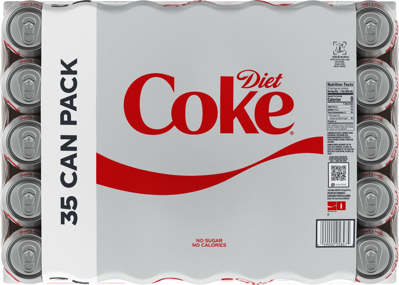 Diet Coke® is a delicious, crisp tasting, no calorie sparkling cola that gives you the refreshment you want throughout the day. It’s the original sparkling beverage for those who want great flavor without the calories - a drink for those with great taste. • Brand: Diet coke • Pack size: 35 • Number of servings: 35 • The Coca-Cola Company, Atlanta, GA, 30313 • Packaging: Reusable