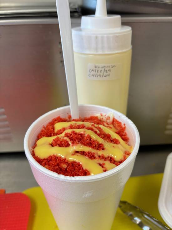 Fresh corn smothered in a spicy Hot Cheetos seasoning.