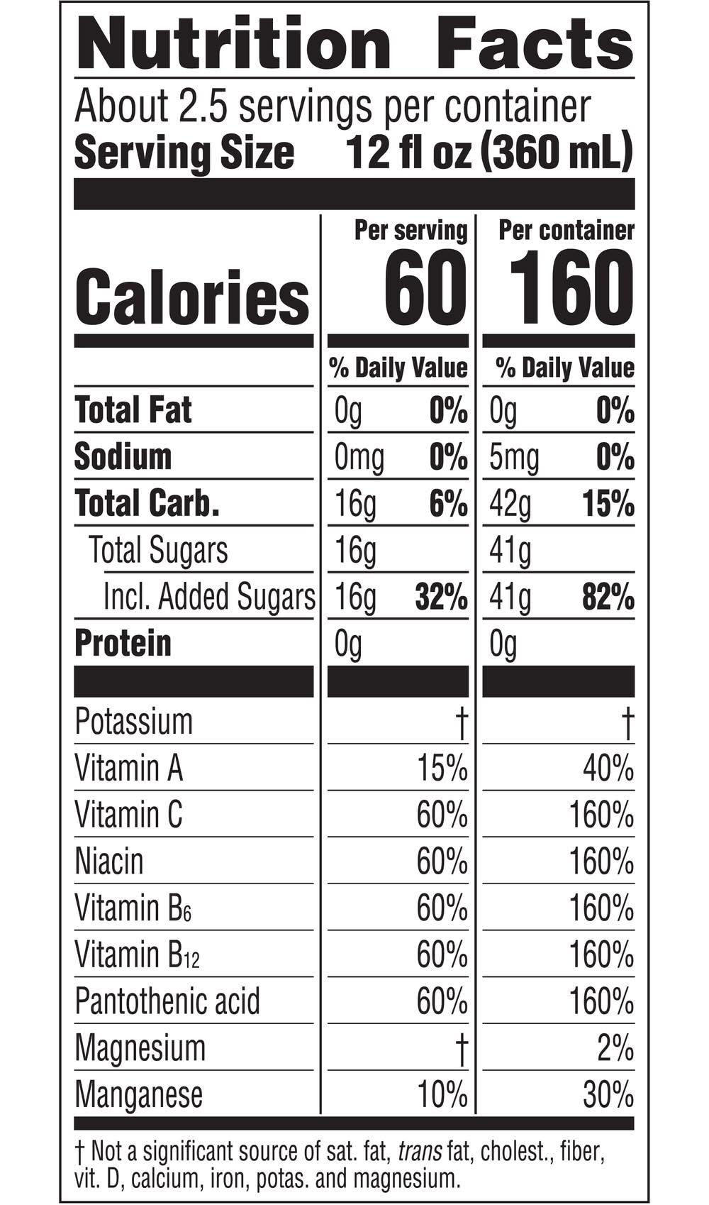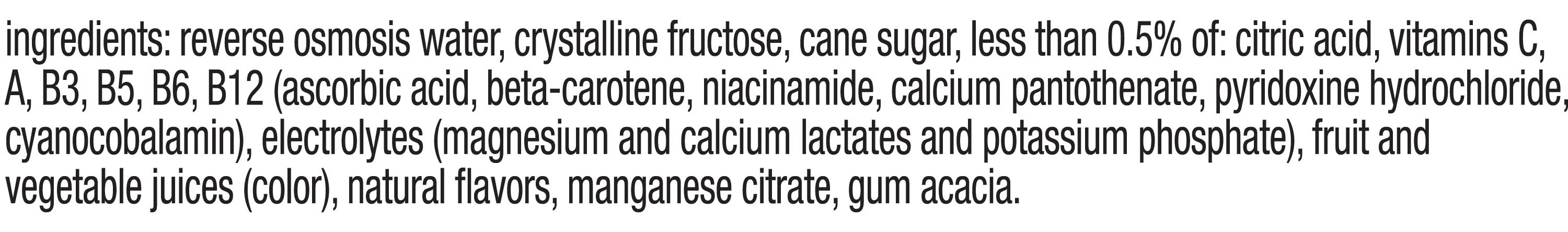 Ingredients: Reverse Osmosis Water, Crystalline Fructose, Less Than 0.5% Of: Vitamins A, C, B3, B5, B6, B12 (Beta-Carotene, Ascorbic Acid, Niacinamide, Calcium Pantothenate, Pyridoxine Hydrochloride, Cyanocobalamin), Sodium Selenate, Manganese Citrate, Electrolytes (Magnesium And Calcium Lactates And Potassium Phosphate), Cane Sugar, Citric Acid, Gum Acacia, Natural Flavors, Fruit And Vegetable Juices (For Color).