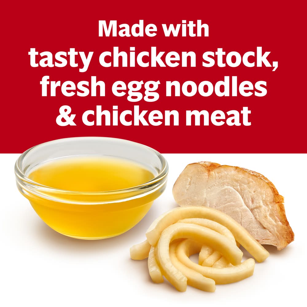 Ingredients: INGREDIENTS: CHICKEN STOCK, ENRICHED EGG NOODLES (WHEAT FLOUR, EGGS, NIACIN, FERROUS SULFATE, THIAMINE MONONITRATE, RIBOFLAVIN, FOLIC ACID), CHICKEN MEAT, CONTAINS LESS THAN 2% OF: SALT, CHICKEN FAT, WATER, MONOSODIUM GLUTAMATE, CORNSTARCH, MODIFIED CORNSTARCH, NATURAL FLAVORING, DRIED CHICKEN BROTH, SUGAR, BETA CAROTENE FOR COLOR, ONION POWDER, SOY PROTEIN ISOLATE, SODIUM PHOSPHATE, YEAST EXTRACT, DRIED CHICKEN, GARLIC EXTRACT. CONTAINS: EGG, WHEAT, SOY. Contains: CONTAINS: Egg, Gluten, Soybean, Wheat