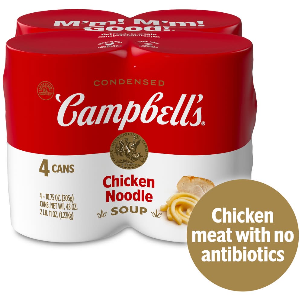Cozy up with a steamy bowl of Campbell’s Condensed Chicken Noodle Soup. A family favorite for generations, this delicious chicken soup is crafted with perfectly seasoned golden chicken broth, egg noodles, and tender chicken meat with no antibiotics. The result is a canned chicken noodle soup that brings a smile with every spoonful. Top it with Pepperidge Farm Golden Butter Crackers, season it with fresh herbs, or pair it with a sandwich or salad for something quick and easy. This convenient canned soup is a year-round pantry staple and the perfect comfort food on a chilly day or when you’re feeling under the weather. Simply mix the condensed soup with 1 can of water and microwave on high for 2.5 to 3 minutes in a covered microwave-safe bowl, or heat in a pot on the stove, stirring occasionally. Each 10.75 oz recyclable can contains about 2.5 servings of microwave soup and features a non-BPA lining. From Chicken Noodle to Cream of Mushroom and everything in between, Campbell’s makes delicious soups in flavors your family knows and loves, with quality, farm-grown ingredients in every can. • Pack size: 4 • Campbell Soup Company, Camden, NJ. • Packaging: Reusable