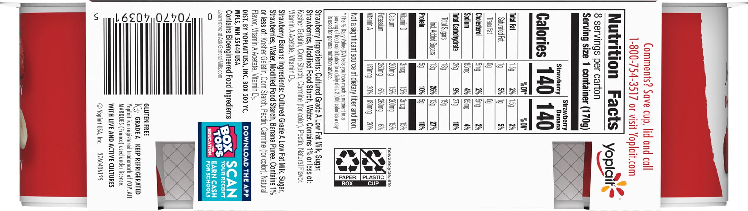 It is delicious addition to an easy breakfast or snack. Made with real fruit plus live and active yogurt cultures, there are no artificial flavors or colors from artificial sources, and no high fructose corn syrup. Each serving is a good source of vitamin D and calcium, an excellent source of vitamin A, and gluten free. Enjoy the yogurt plain, pair it with granola. Make it a tasty alternative to Greek yogurt. Or stock up for quick snacks for the family. Also try our other varieties, such as low fat French vanilla yogurt and low fat mixed berry yogurt. Store Yoplait Yogurt in the refrigerator and keep cold until you're ready to grab a spoon and enjoy. It brings goodness to everyday moments, one serving of yum at a time. • Flavor: Strawberry-strawberry banana • Pack size: 8 • Packaging: Reusable