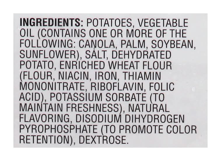 Ingredients: Potatoes, Vegetable Oil (Contains One or More of the Following: Canola, Palm, Soybean, Sunflower), Salt, Dehydrated Potato, Enriched Wheat Flour (Flour, Niacin, Iron, Thiamin Mononitrate, Riboflavin, Folic Acid), Potassium Sorbate (to Maintain Freshness), Natural Flavoring, Disodium Dihydrogen Pyrophosphate (to Promote Color Retention), Dextrose. Contains: Wheat